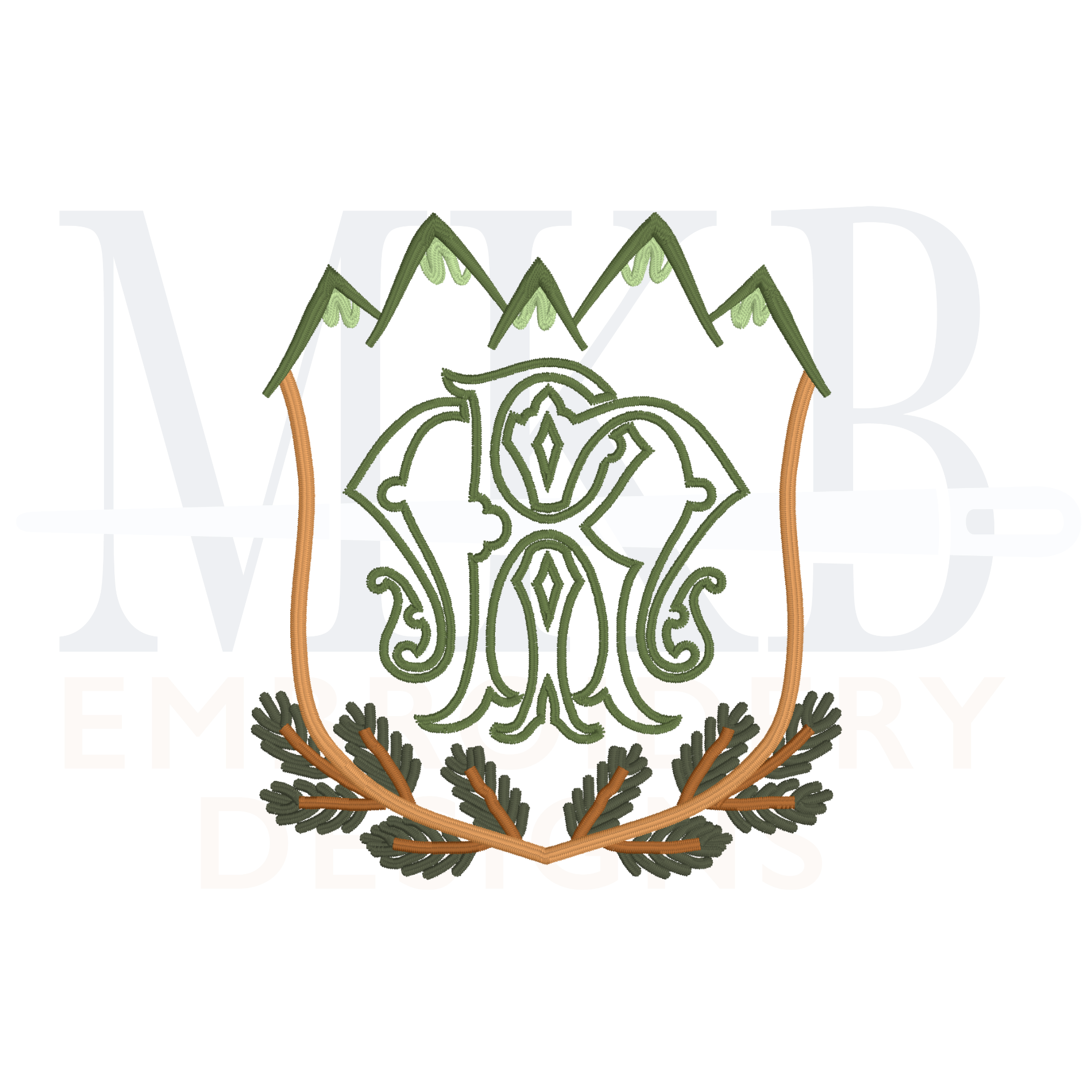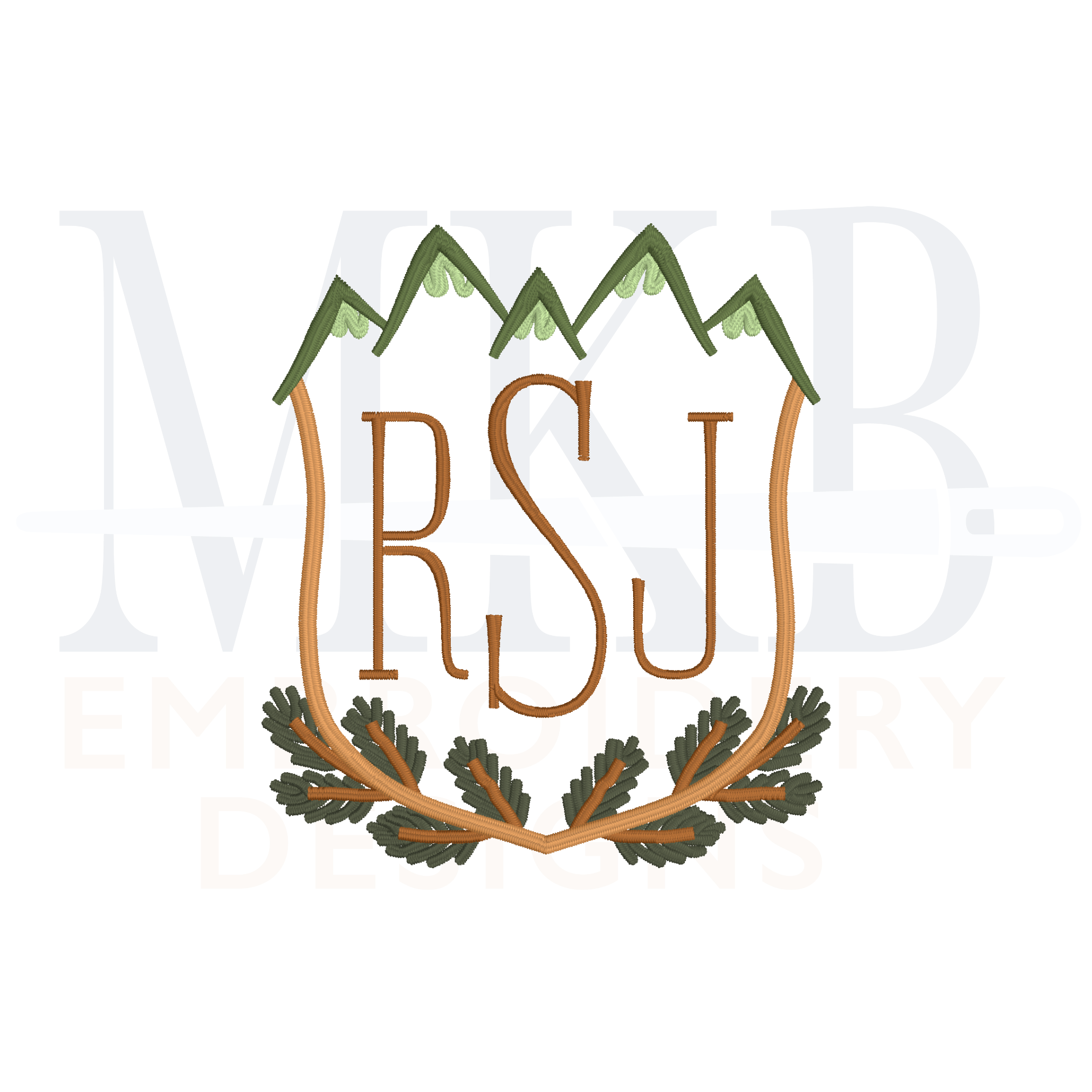 The mountain pine crest is perfect for mountain getaways, weddings, bridal crests, and more. The mountain outline and evergreen crest is finished in a satin stitch. Use this crest embroidery design for guest linens, home decor, hostess gifts, tote bags, garments, and more. Each design has been tested for quality stitching.