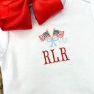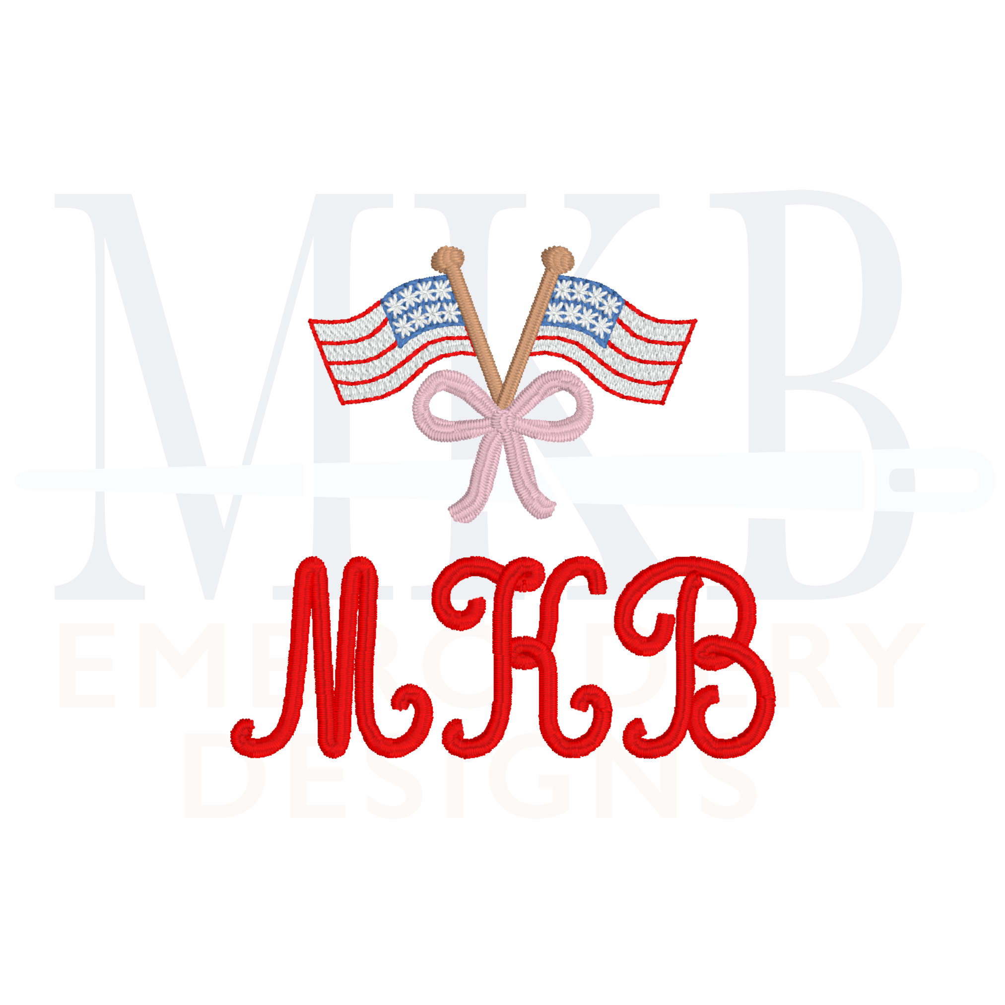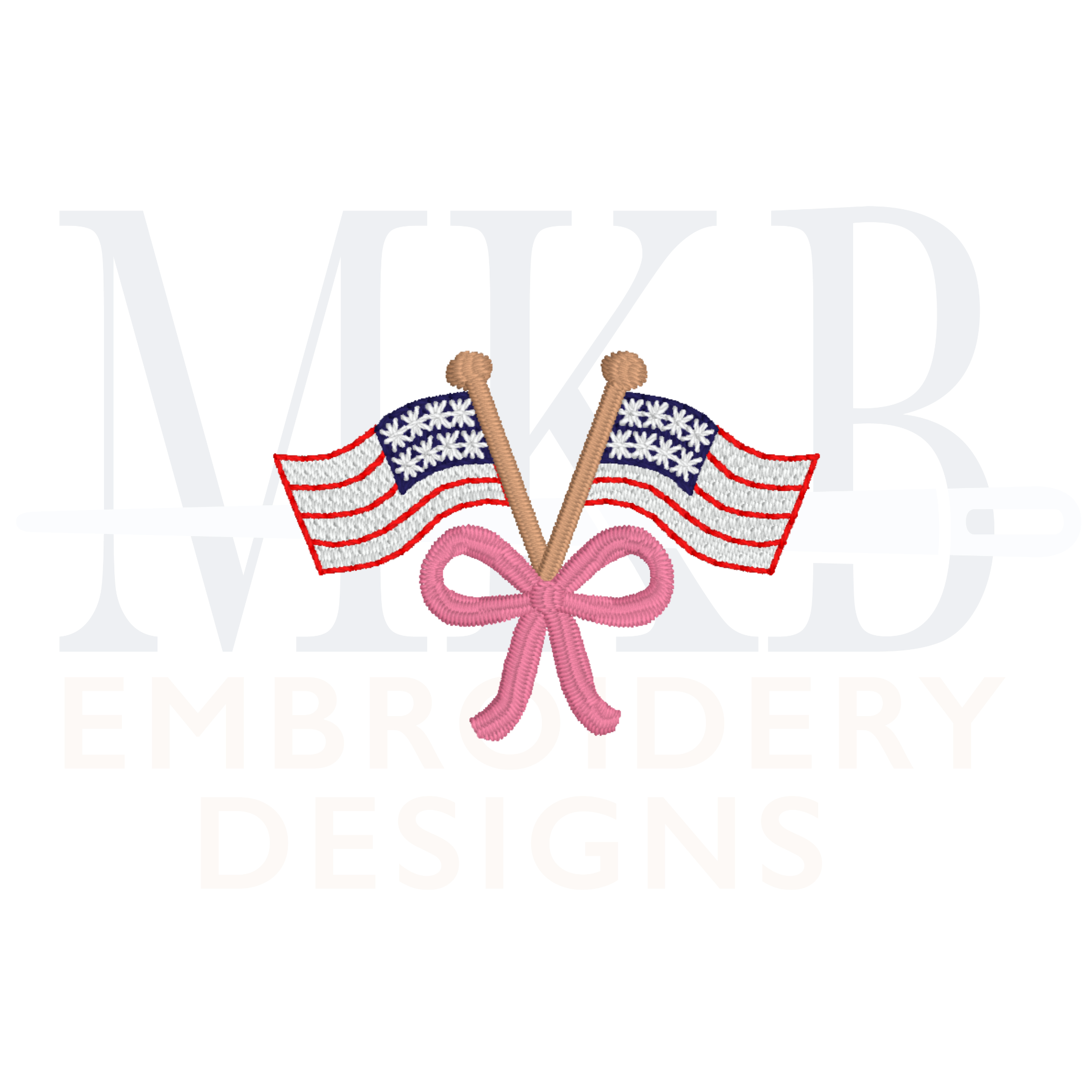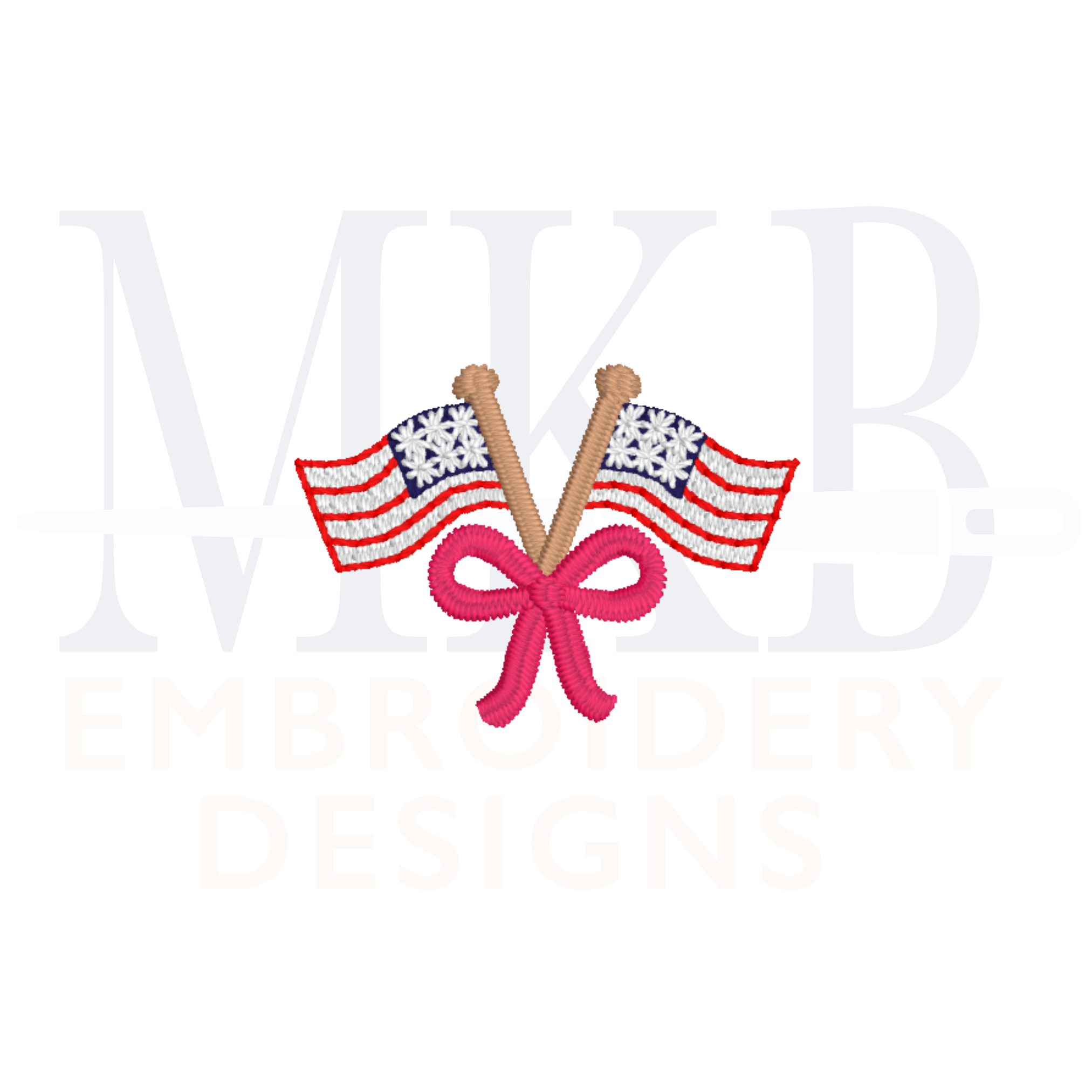The mini crossed American flags version 2 is a five color light fill stitch and satin stitch embroidery design. This version has separate white and blue sections for the stripes and stars areas with a bean stitch outline and star motif overlay. (Version one has one color section under the entire stripes and stars areas). The quick stitch light fill is denser than a sketch but less dense than a fill. Use this mini patriotic flag and coquette bow design to embellish garments such as dresses, tees, t-shirts, bodysuits, and more. The embroidery design also works great on party decor such as napkins, cocktail napkins, table linens, guest towels, and more. Perfect for patriotic 4th of July gatherings, parties, Labor Day, July 4th, or summer themed celebrations.