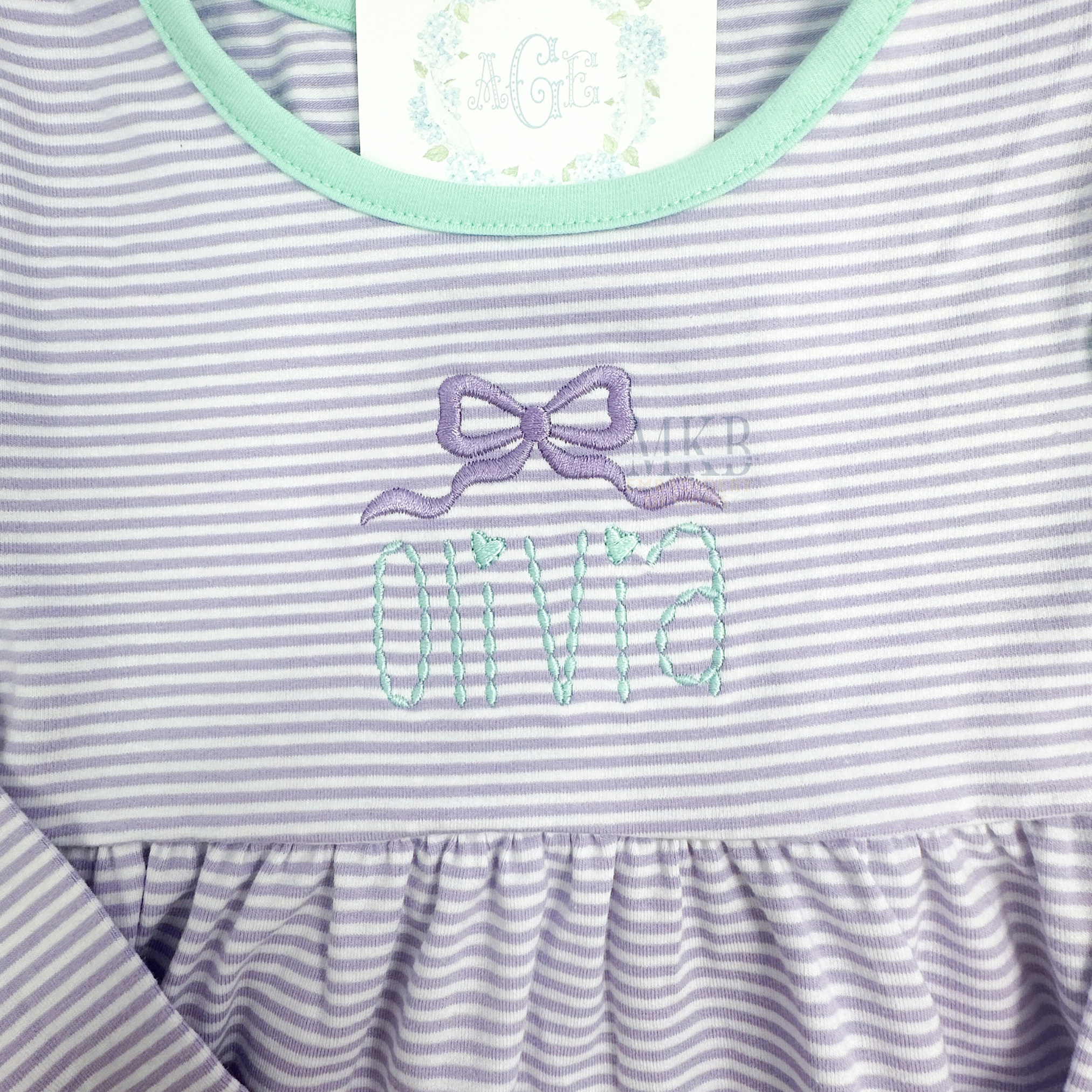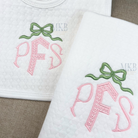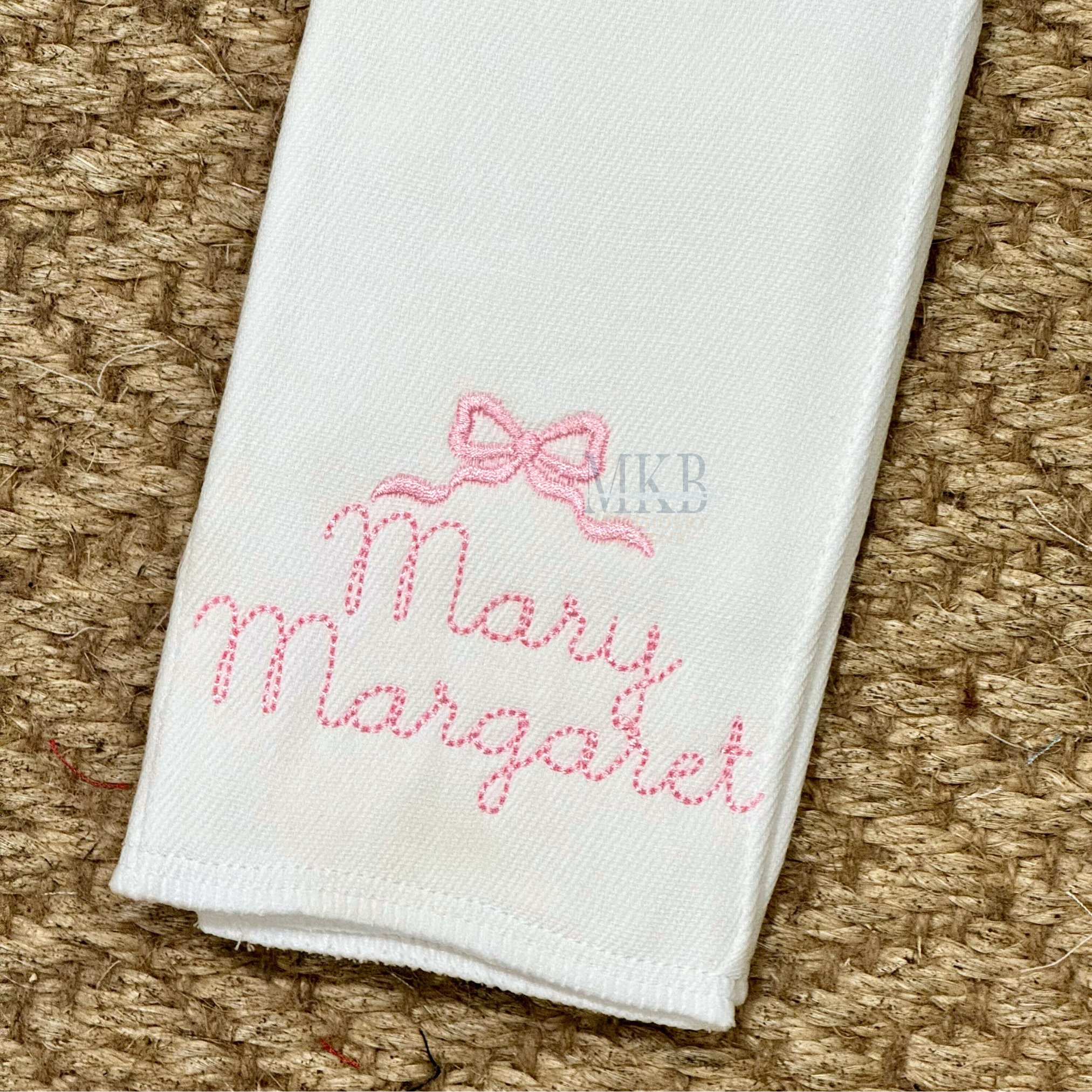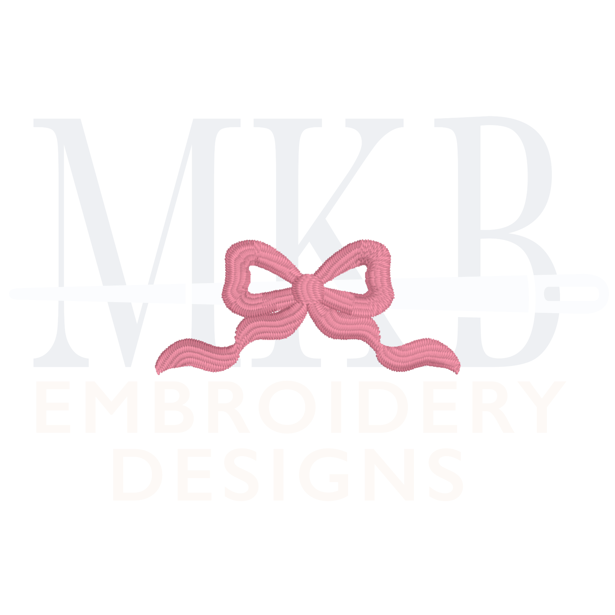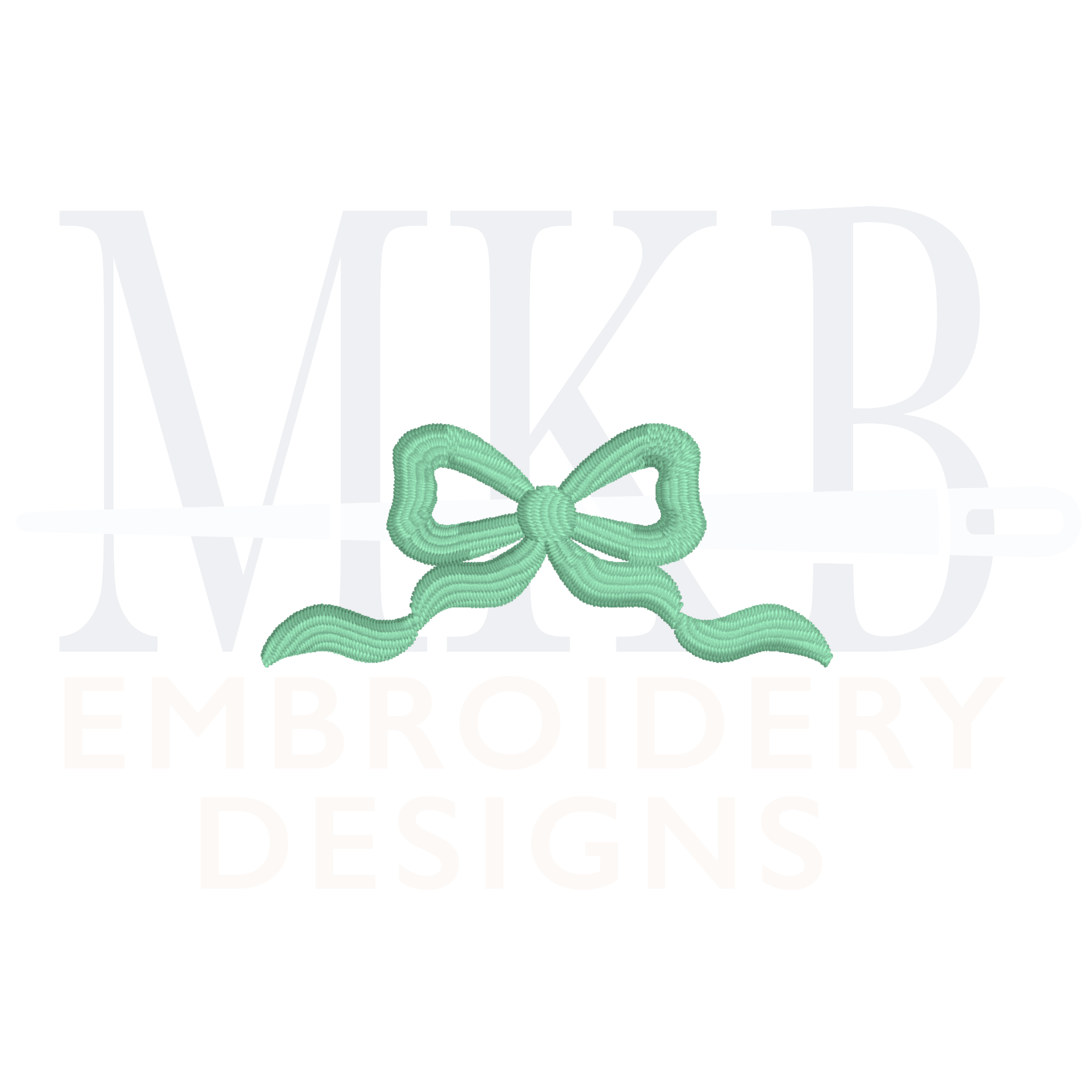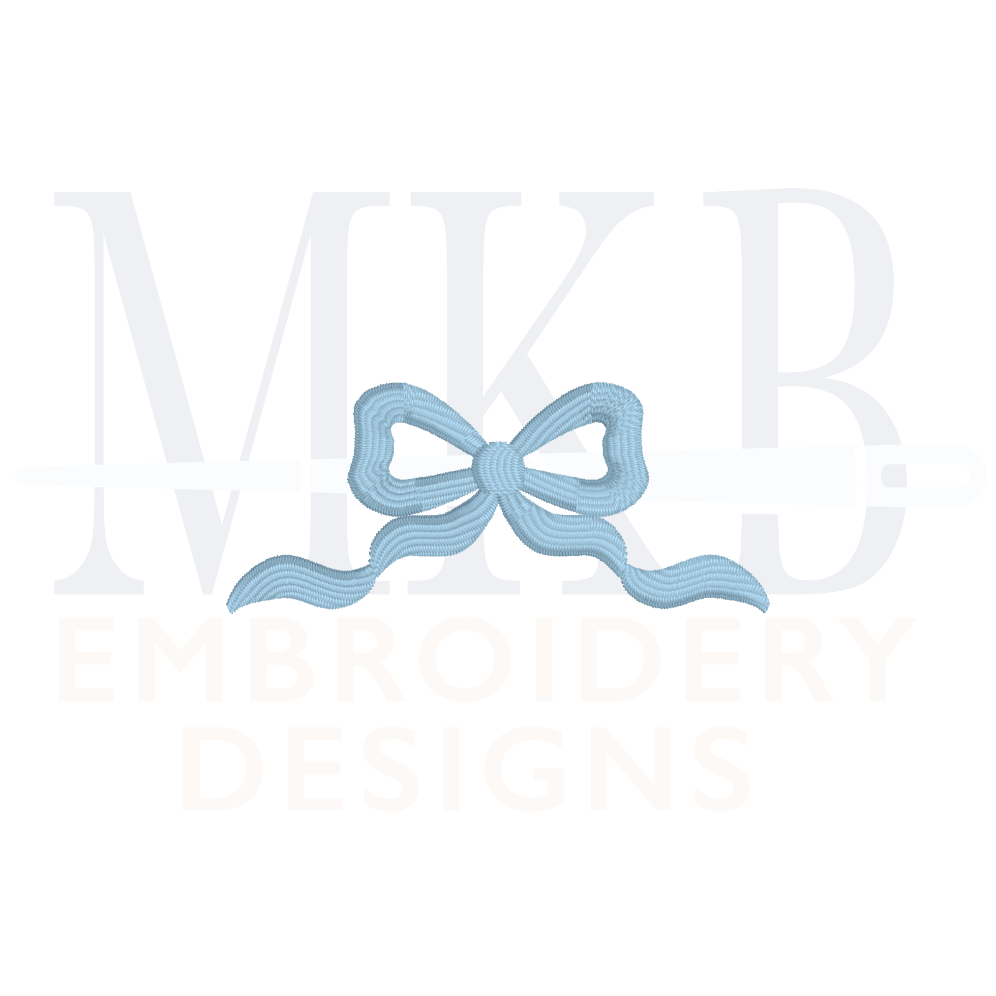 The mini bow with side tails is a single color satin stitch embroidery design. Use this simple and classic bow with ribbon tails embroidery design for garments, guest linens, home decor, hostess gifts, tote bags, birth banners, baby announcements, and more. Makes for a sweet baby monogram, Christmas bow, big sister bow, birthday bow, and more!