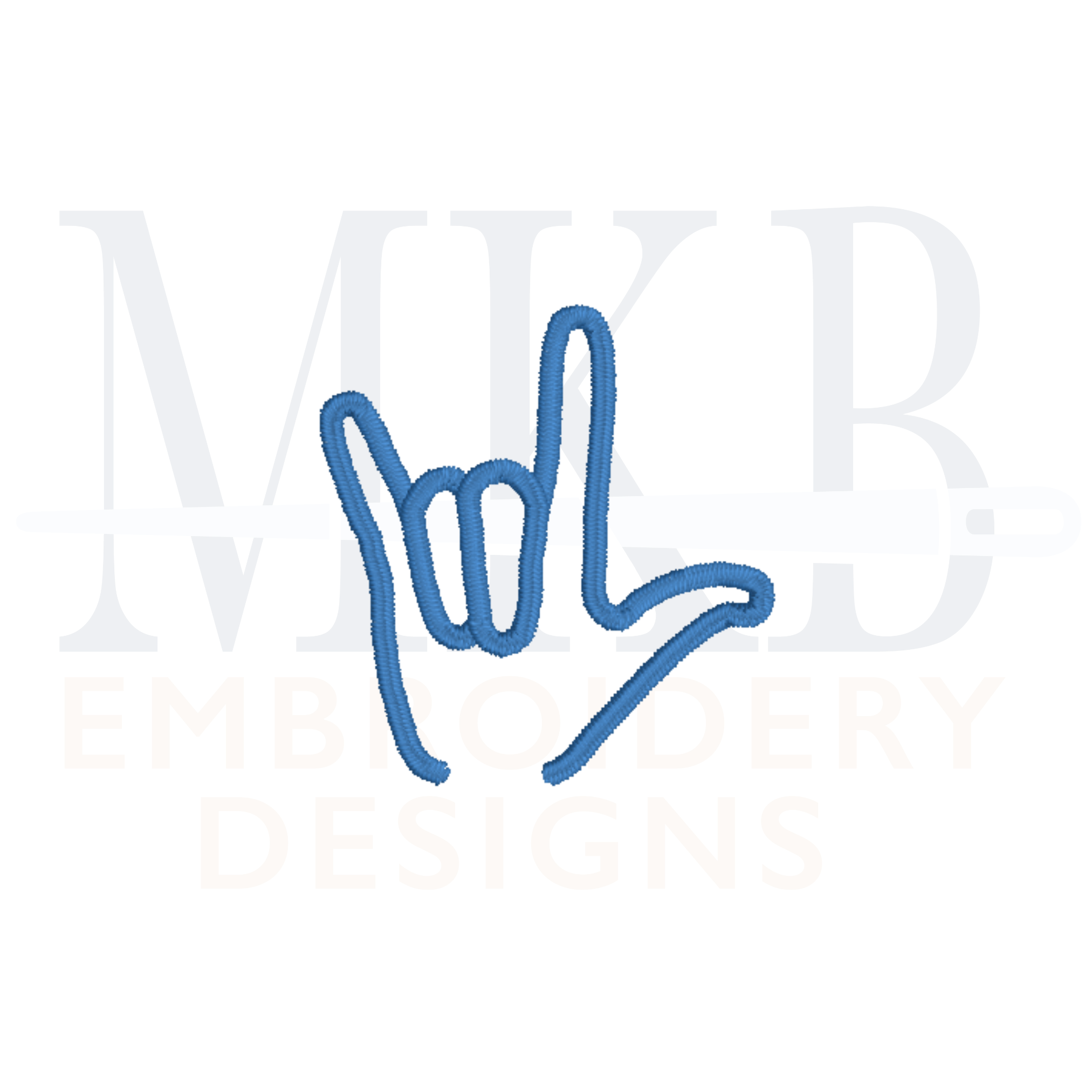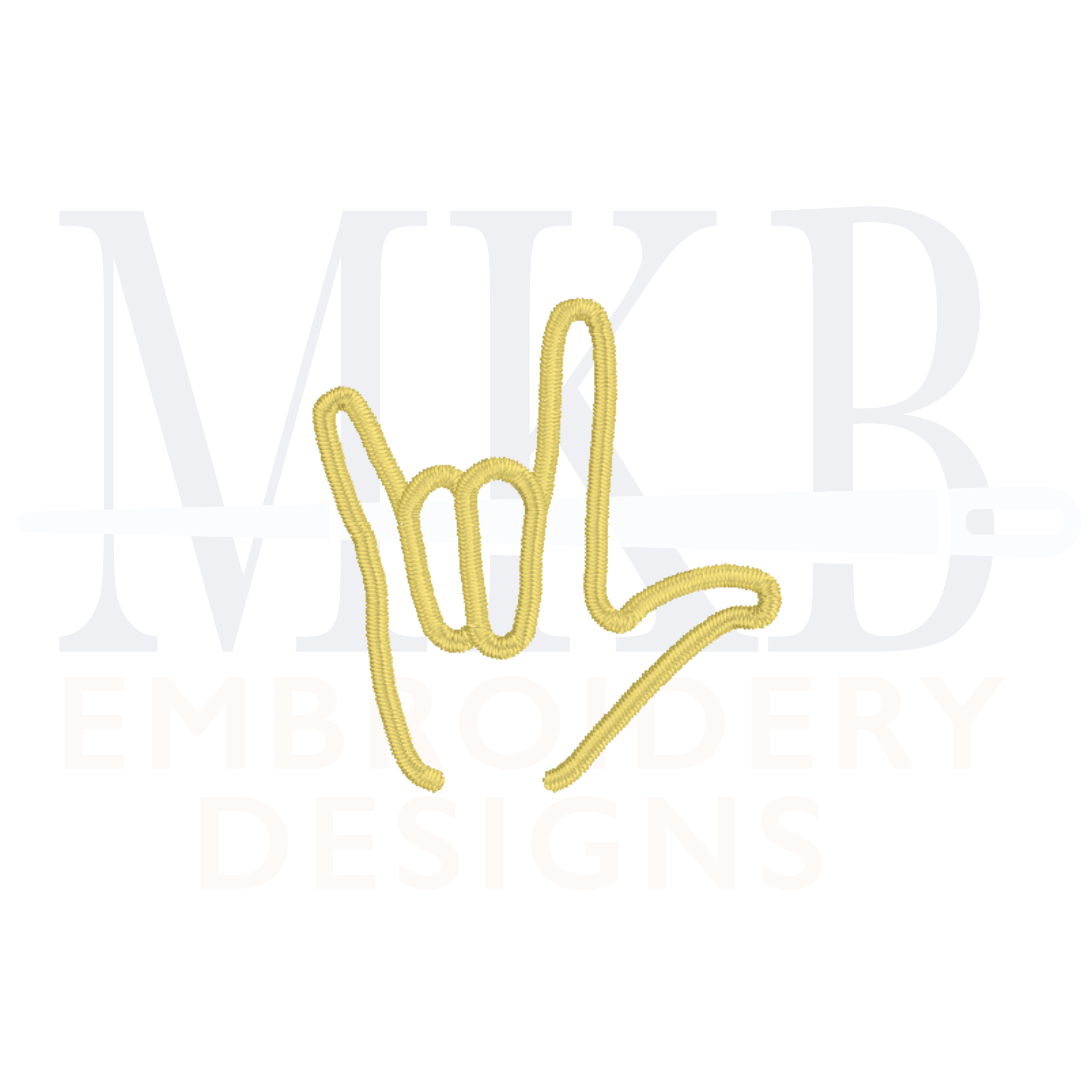 The mini I love you hand sign is a perfect add-on for your monogramming projects. The simple embroidery design outline in a satin stitch is a quick stitch pattern. Use this I love you sign language design to embellish garments such as golf shirts, t-shirts, onesies, and more. Each of our designs have been tested for quality stitching.