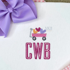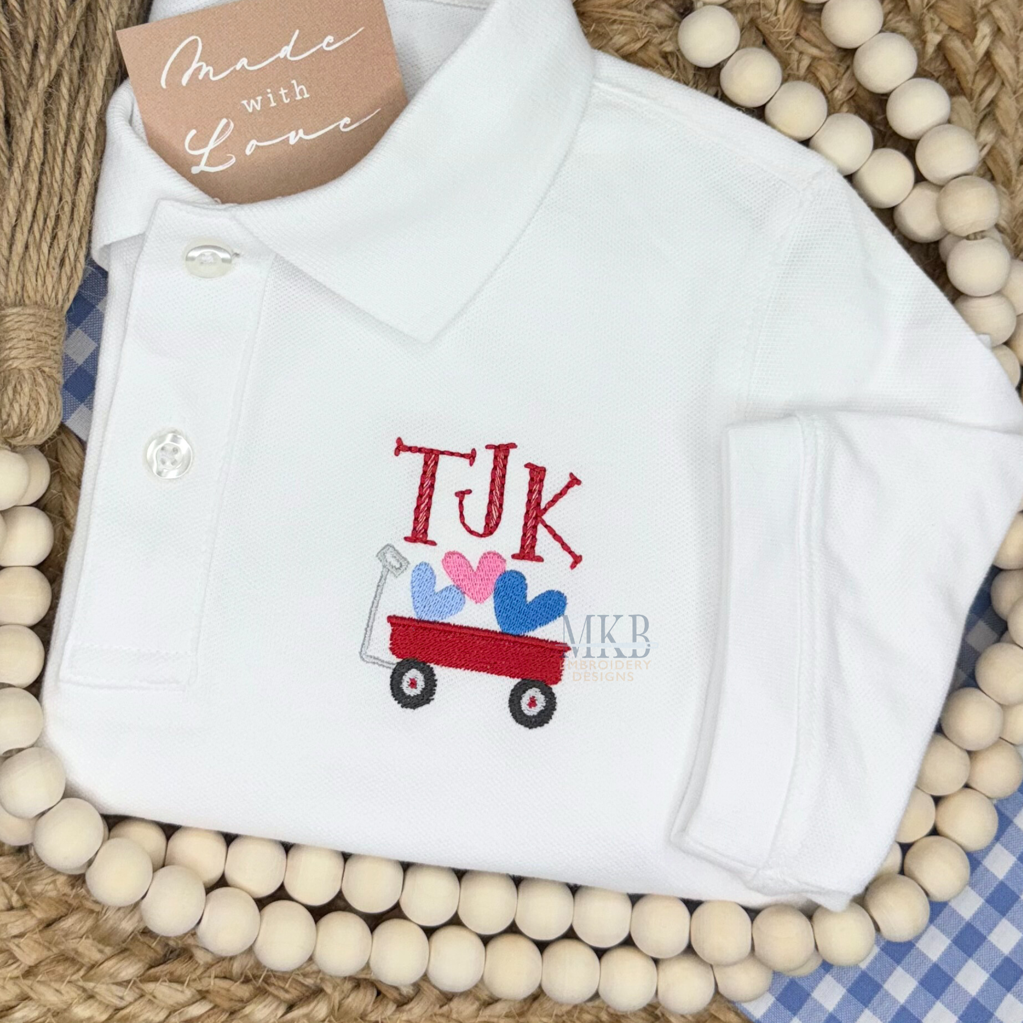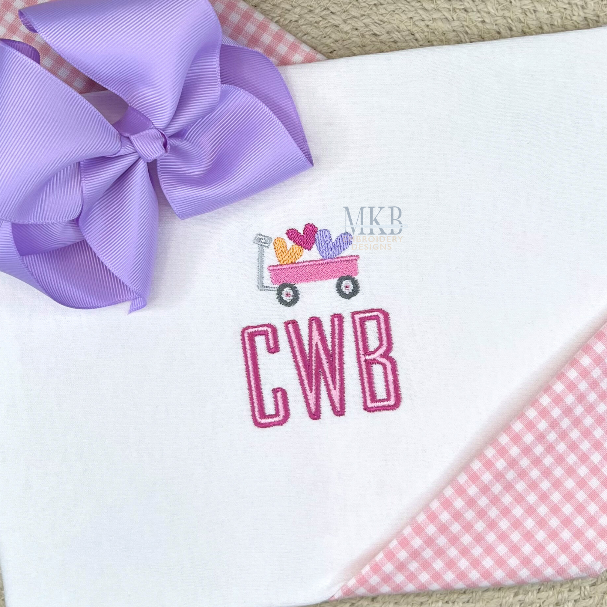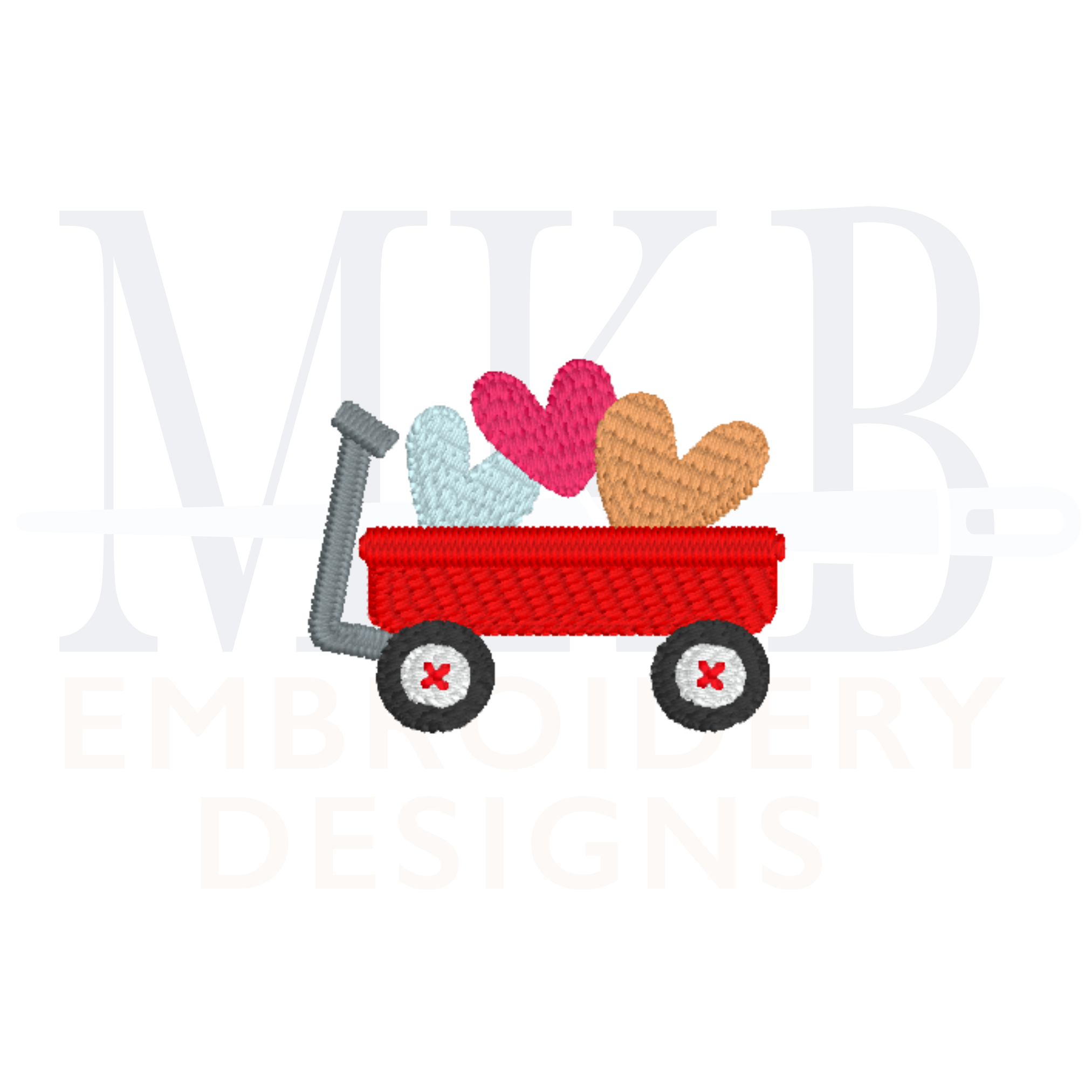 The mini Valentine heart wagon is an eight color satin and fill stitch embroidery design. The classic Valentine's Day embroidery design includes four mini sizes. Perfect for tees, golf shirts, sweatshirts, t-shirts, bodysuits, burp towels, tote bags and more.