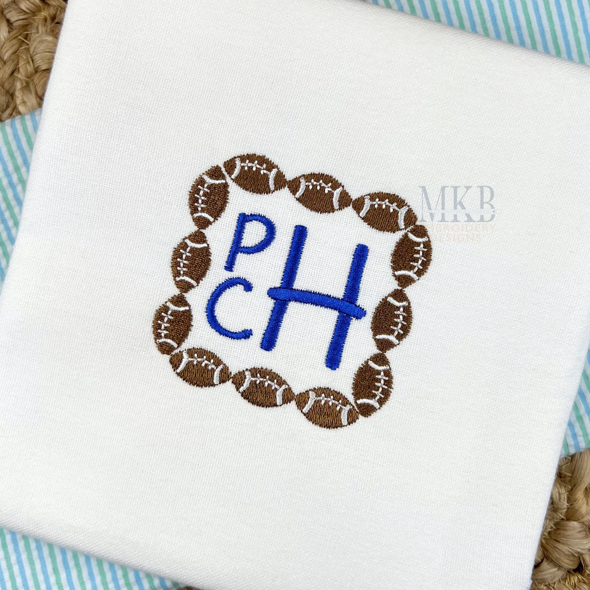 The football square monogram frame is a perfect embroidery add-on.  The footballs are a two color fill and satin stitch design.  Use this football embroidery design to embellish garments, accessories, and more. Perfect for sport monograms, game day embroidery projects, and tailgating events.