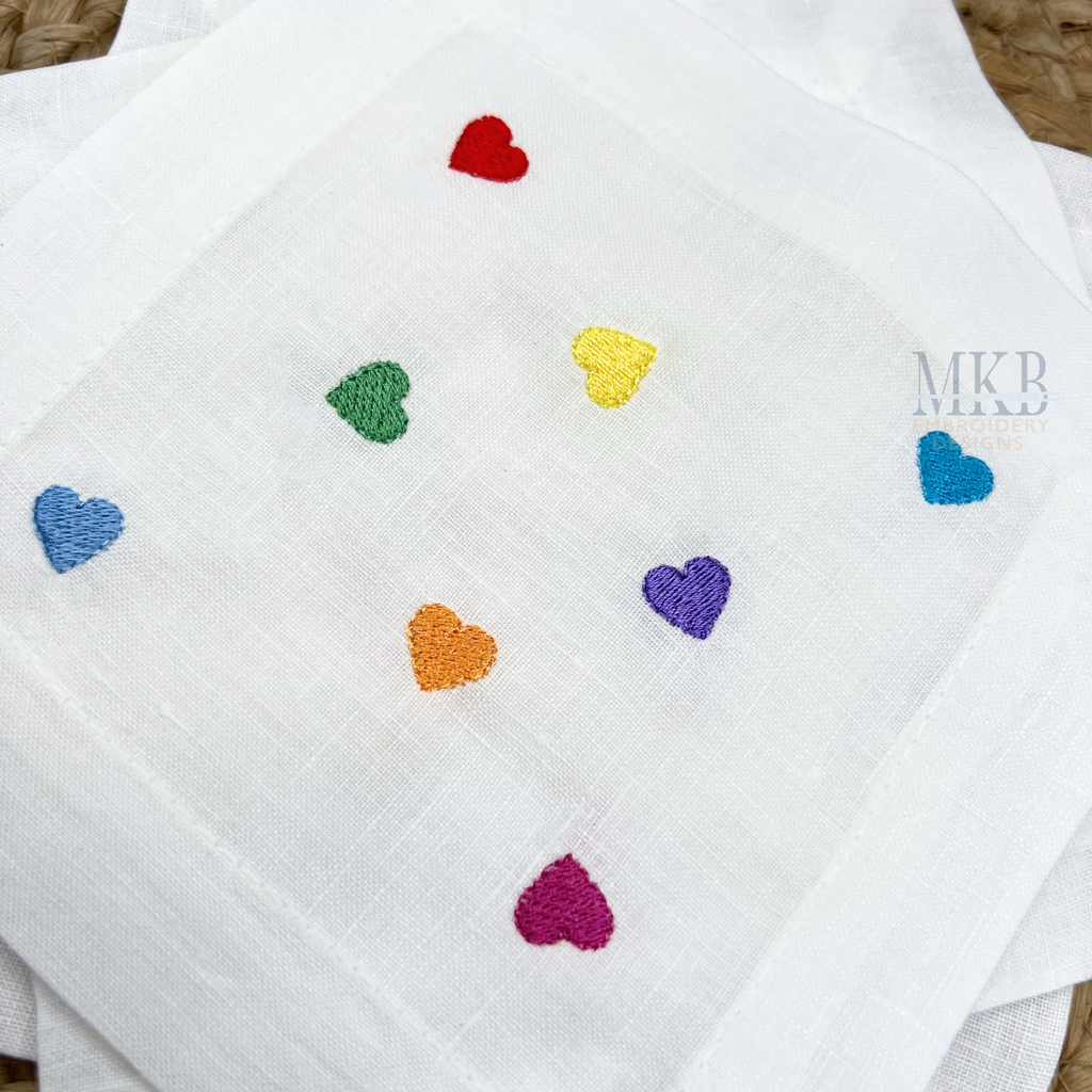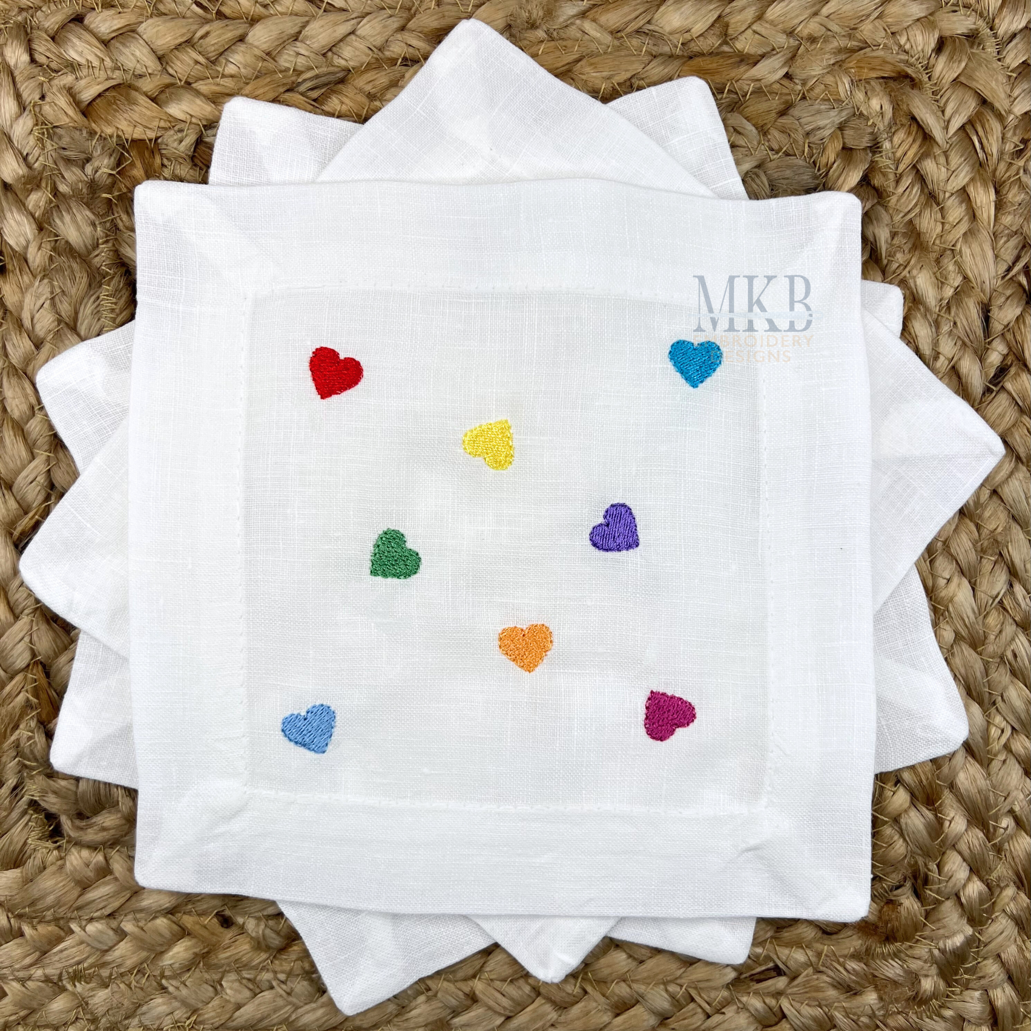 The tiny puff hearts are arranged for you in a scattered pattern with a quick stitch single color option (1C) as well as a multi-color design option (MC). The tiny hearts are arranged for you and sized to fit inside a 6x6 cocktail napkin. The hearts are a single color fill stitch embroidery design. The cocktail napkin embroidery design files include three different sizes, depending on the center space/size of your cocktail napkins. Use this classic and timeless mini fill puff heart design to embellish cocktail napkins or coasters. Perfect for engagement parties, Valentine's Day, hostess gifts, sprucing up your bar cart, Valentine cocktails, bridal luncheons, wedding linens, hostess gifts, baby showers, and more. Each size has been tested for quality stitching.