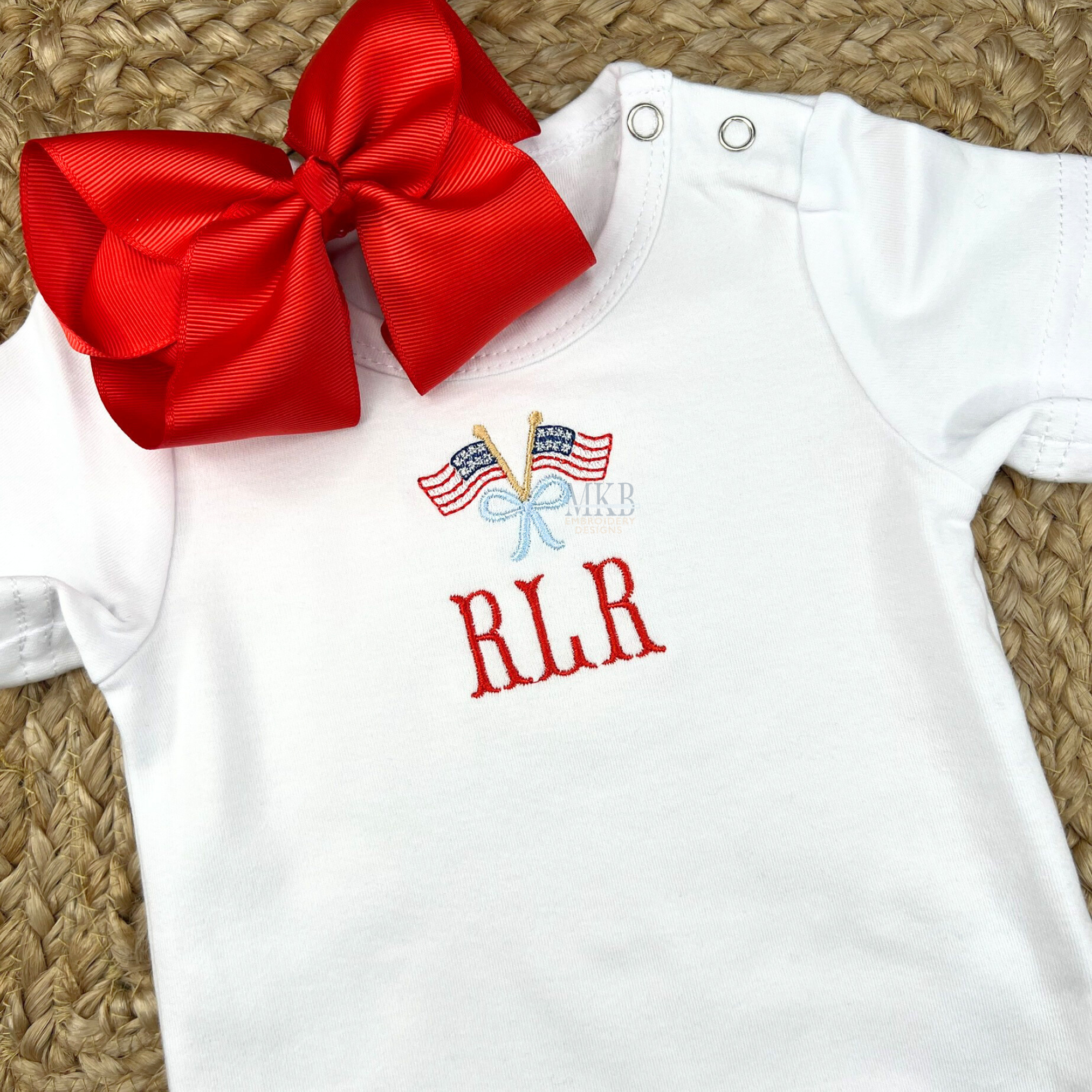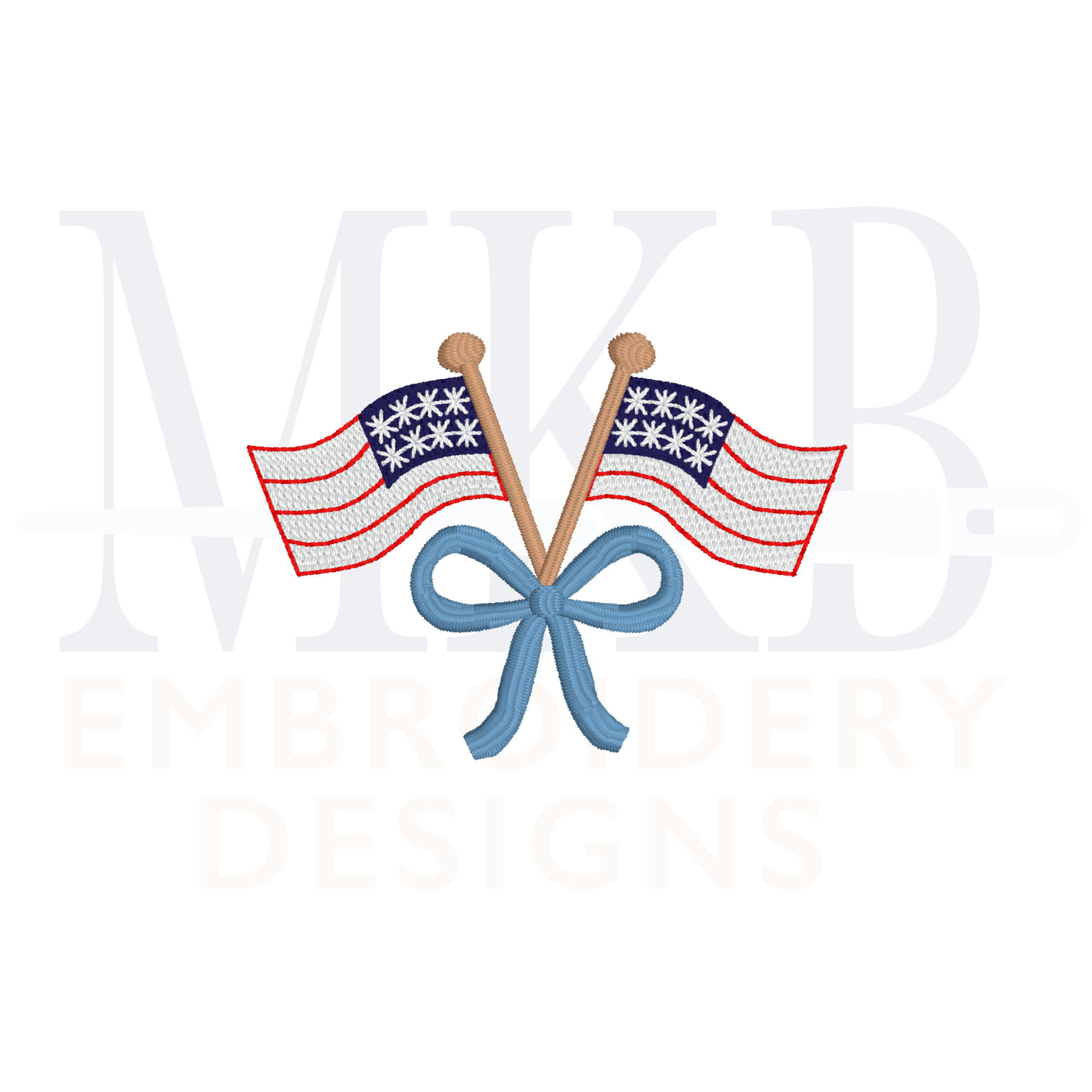 The mini crossed American flags version 2 is a five color light fill stitch and satin stitch embroidery design. This version has separate white and blue sections for the stripes and stars areas with a bean stitch outline and star motif overlay. (Version one has one color section under the entire stripes and stars areas). The quick stitch light fill is denser than a sketch but less dense than a fill. Use this mini patriotic flag and coquette bow design to embellish garments such as dresses, tees, t-shirts, bodysuits, and more. The embroidery design also works great on party decor such as napkins, cocktail napkins, table linens, guest towels, and more. Perfect for patriotic 4th of July gatherings, parties, Labor Day, July 4th, or summer themed celebrations.
