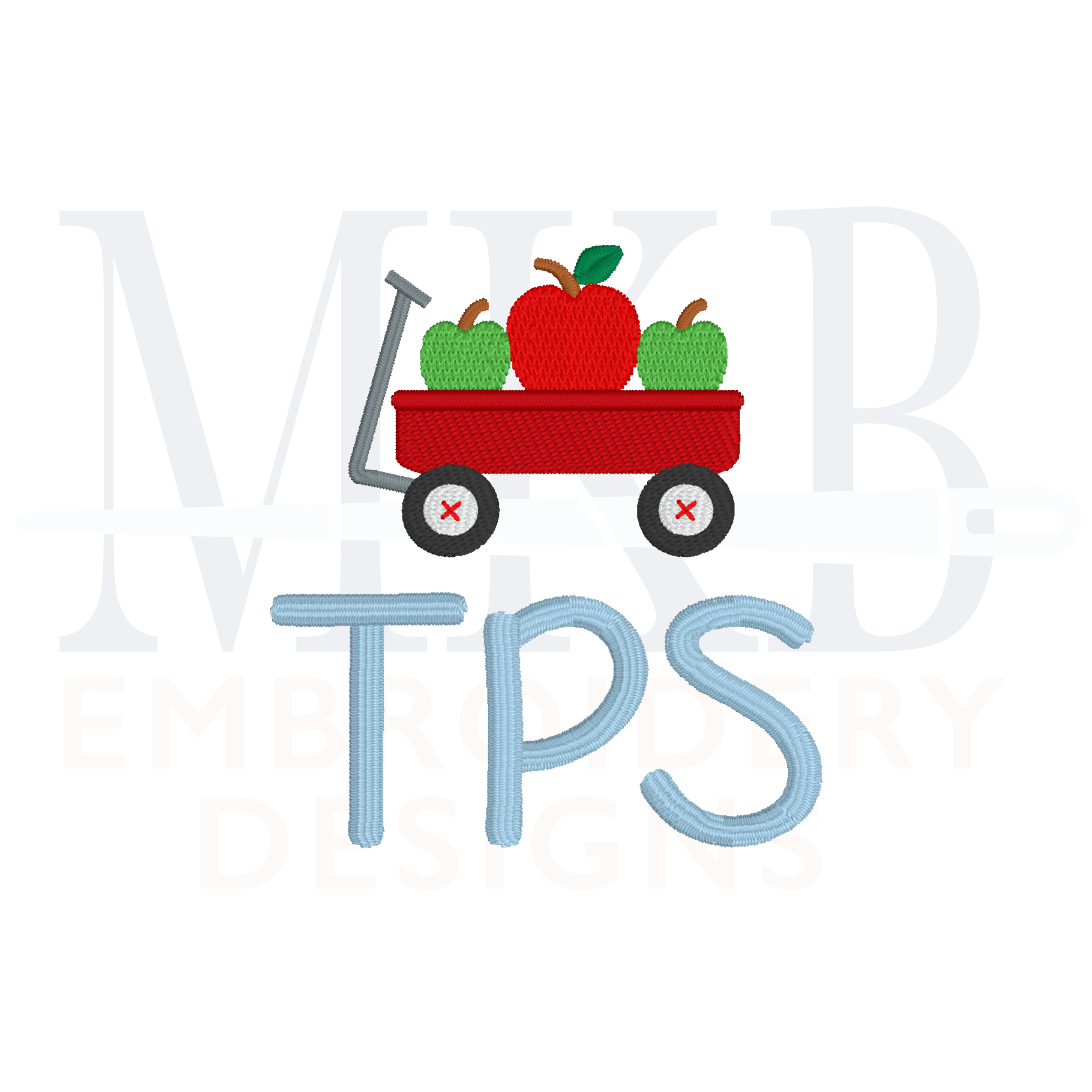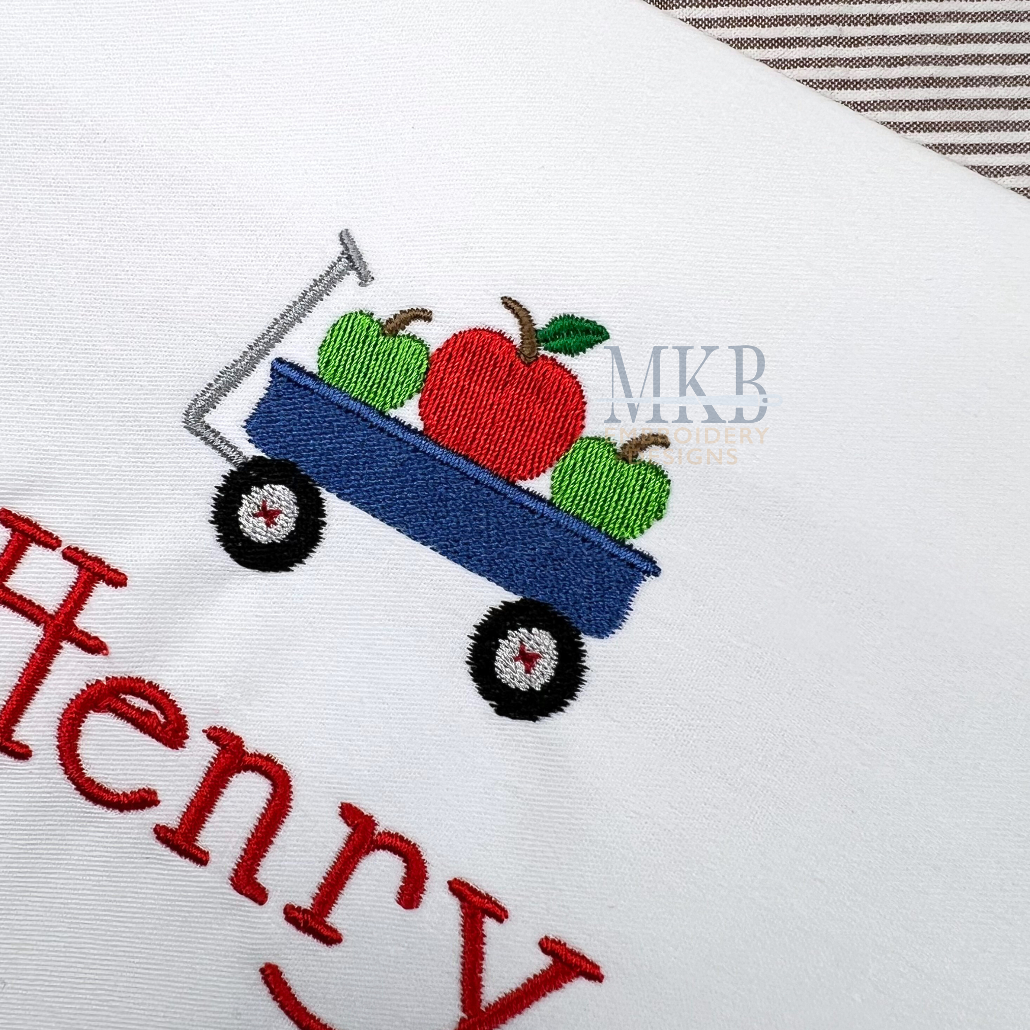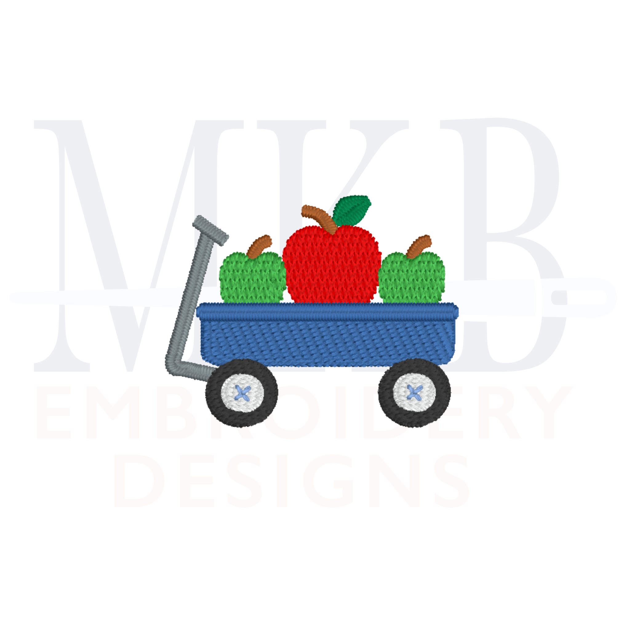The mini apple trio in a wagon is a nine color fill and satin stitch embroidery design. The classic apple embroidery design includes four mini sizes. Perfect for tees, golf shirts, sweatshirts, t-shirts, bodysuits, burp towels, tote bags and more. Each size has been tested for quality stitching.