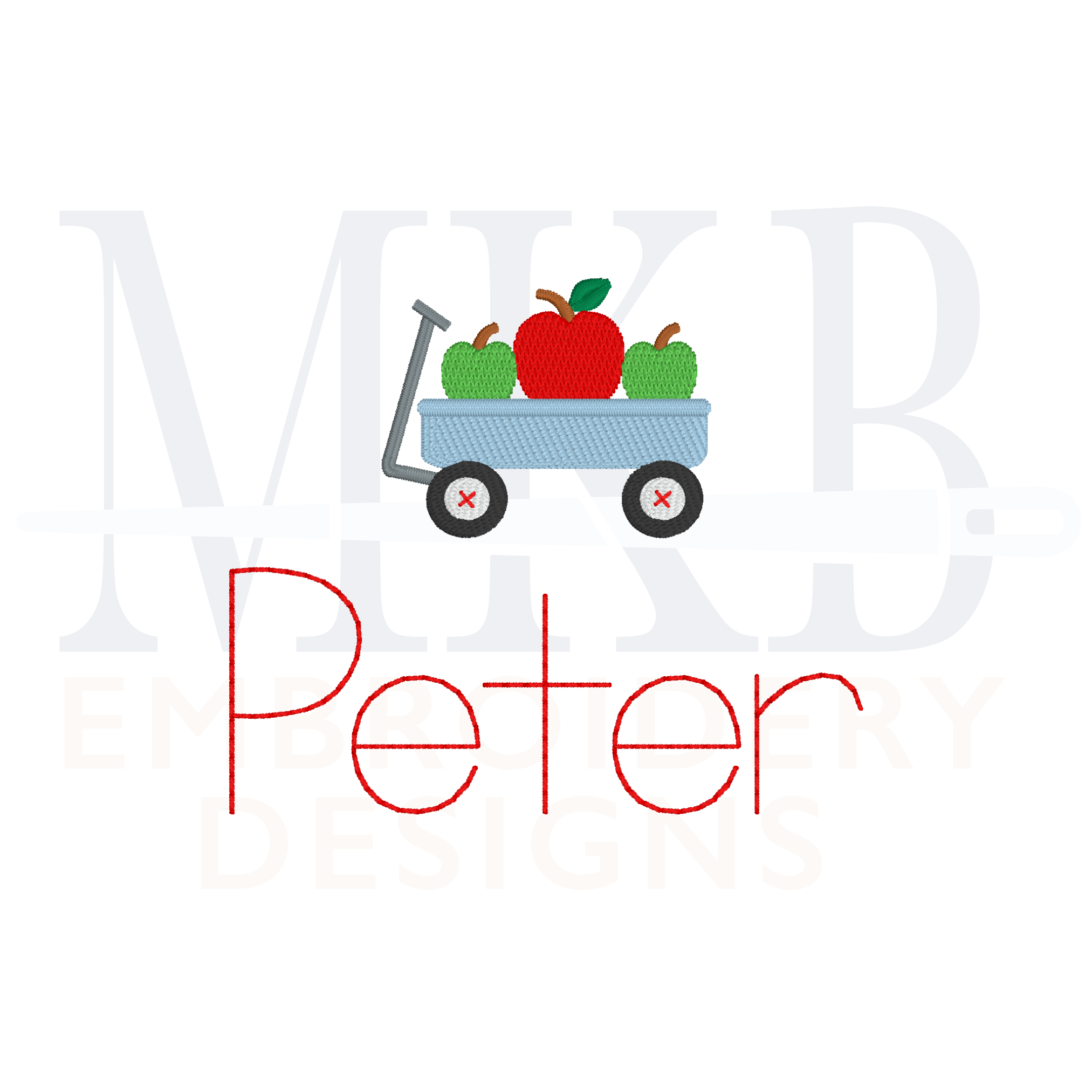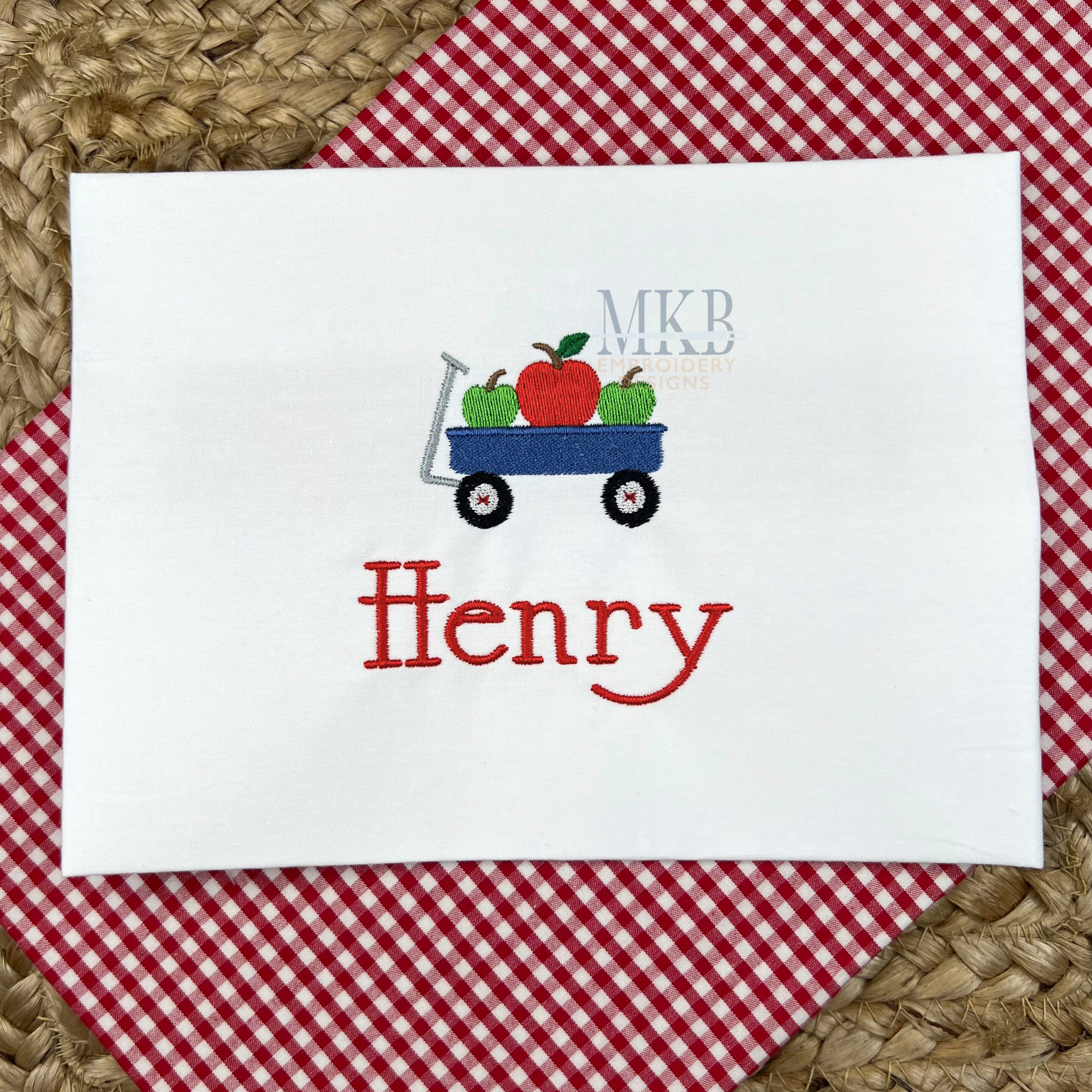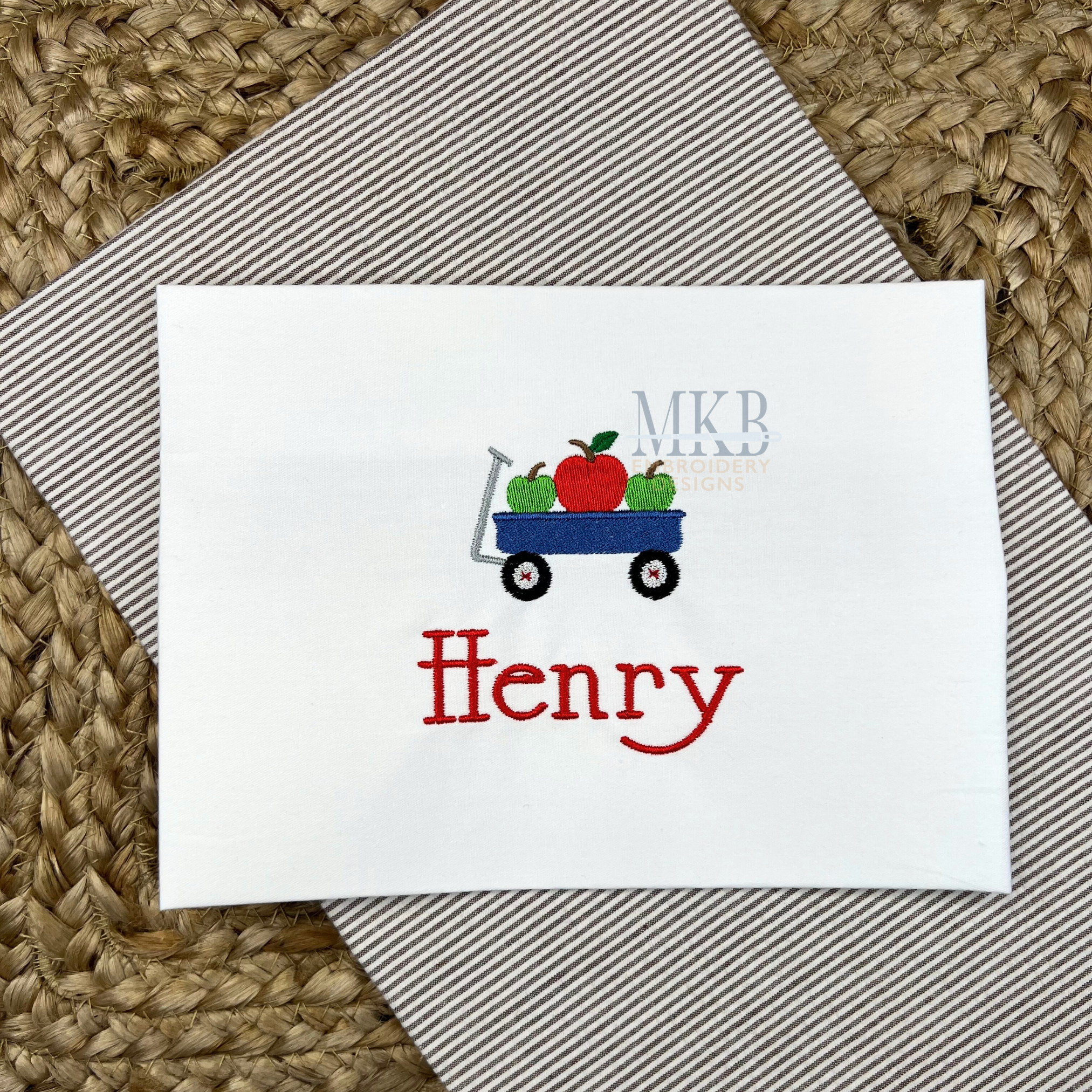 The mini apple trio in a wagon is a nine color fill and satin stitch embroidery design. The classic apple embroidery design includes four mini sizes. Perfect for tees, golf shirts, sweatshirts, t-shirts, bodysuits, burp towels, tote bags and more. Each size has been tested for quality stitching.