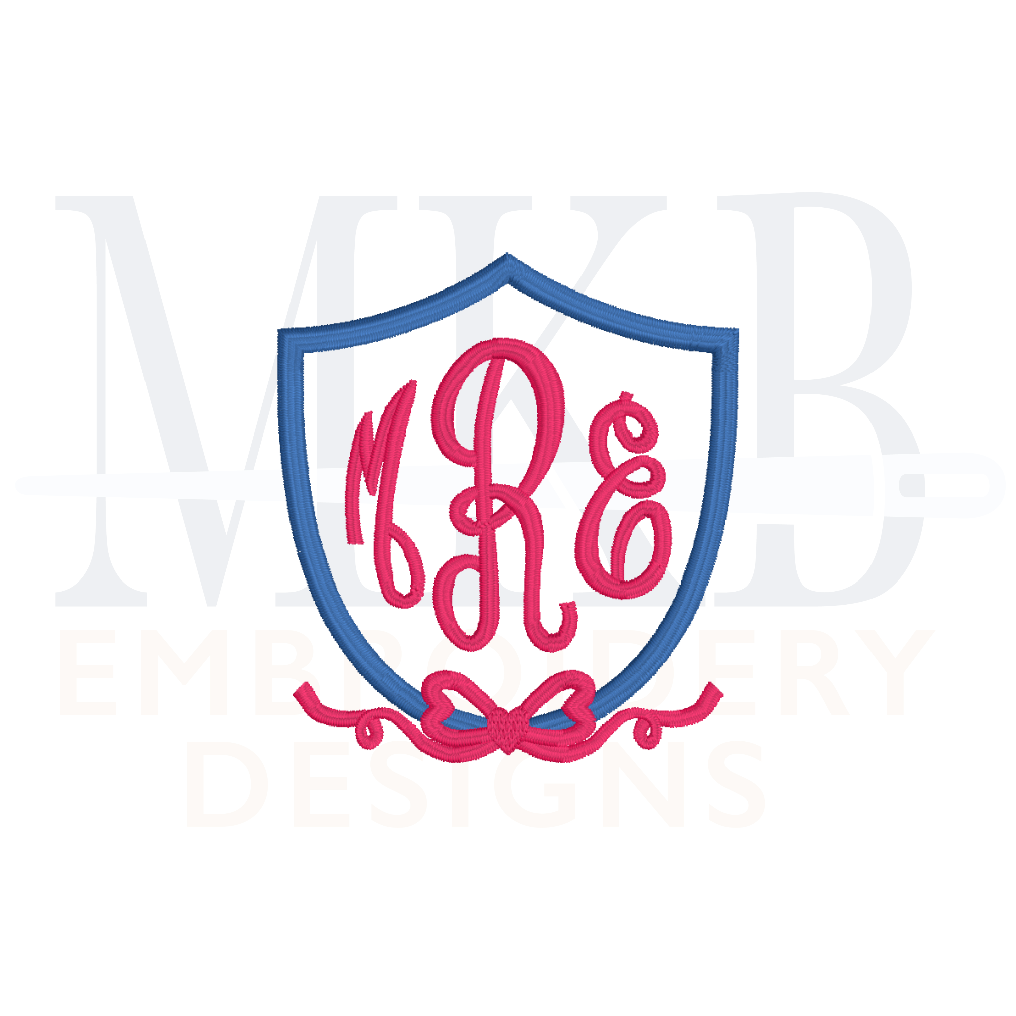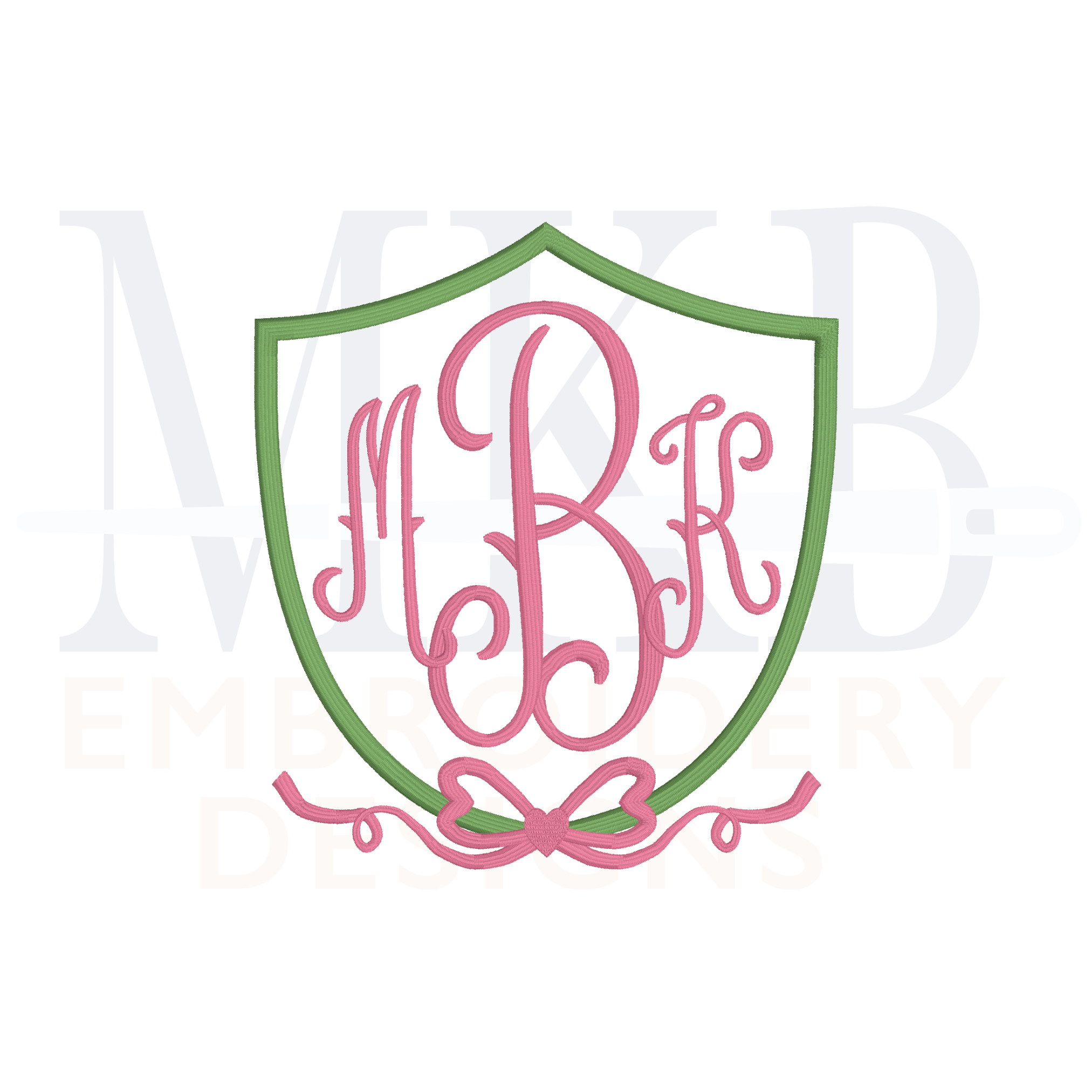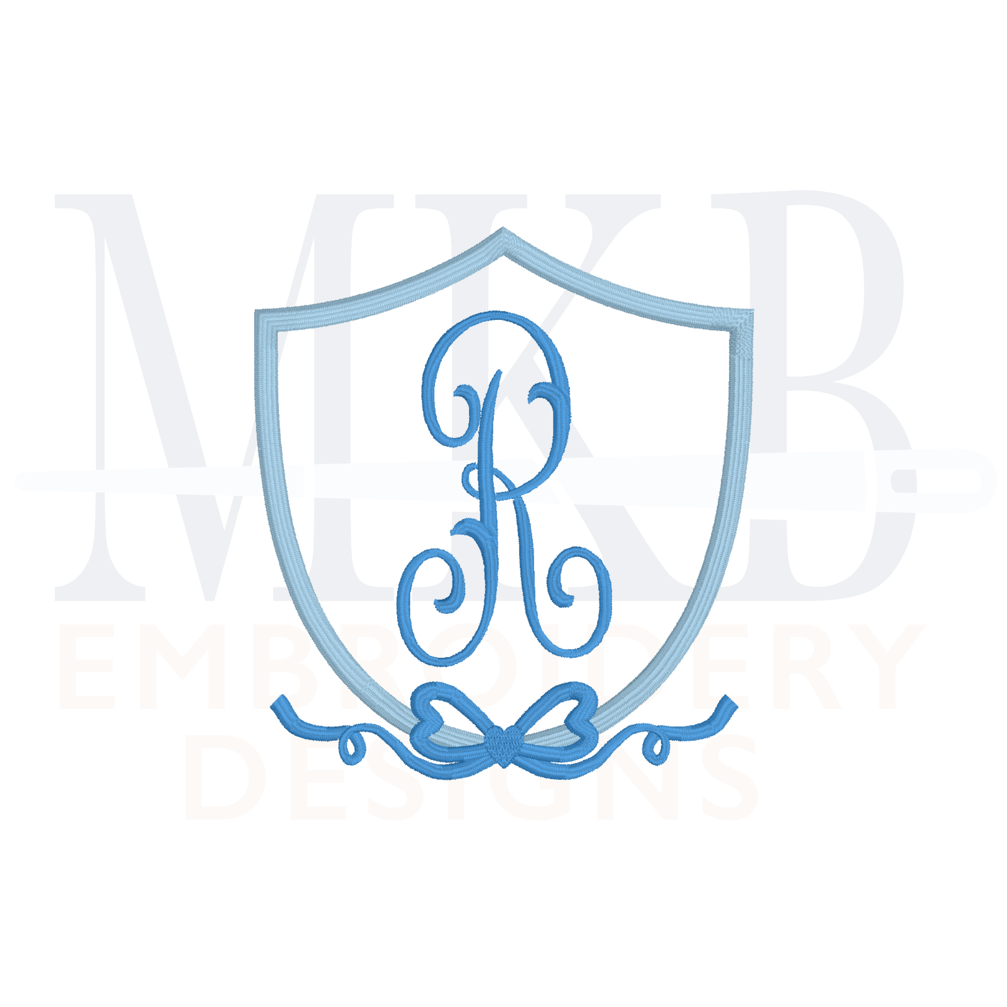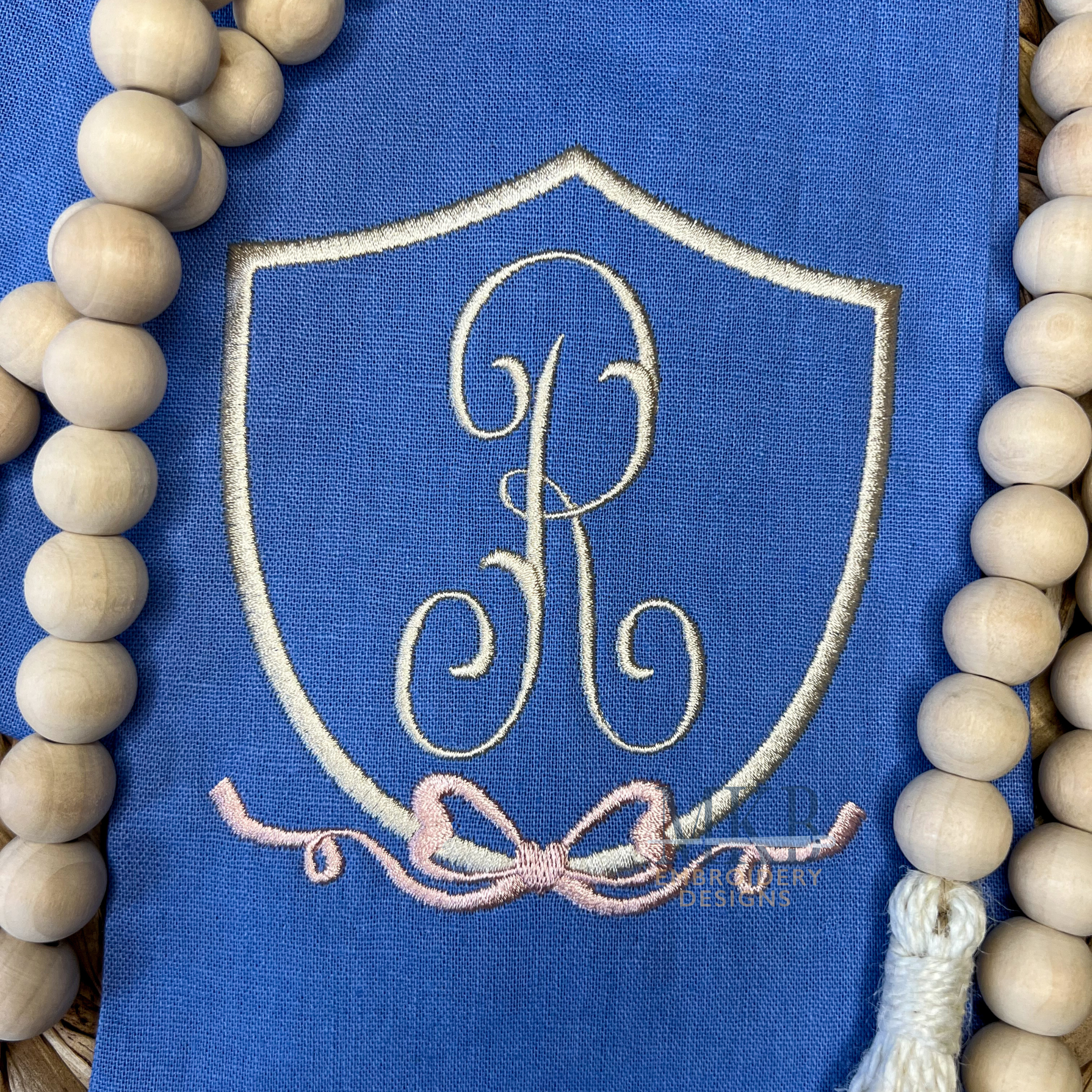 Our bow crest with a center heart knot is a classic and timeless add-on to a monogram. Use this cute bow monogram frame embroidery design to embellish wreath sashes, baby nursery accents, linens, birthday banners, blankets, clothing, bridal linens, Valentine embroidery projects and more! Design has been tested for quality stitching.