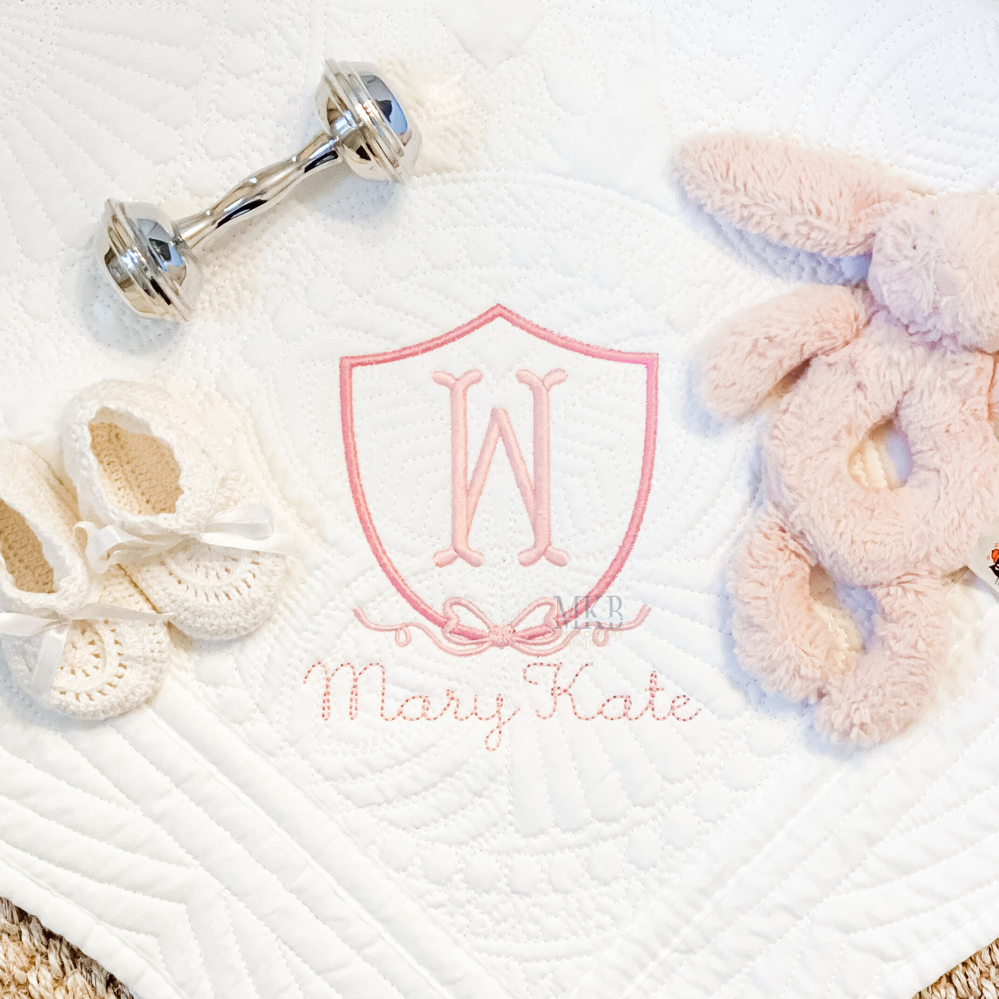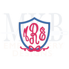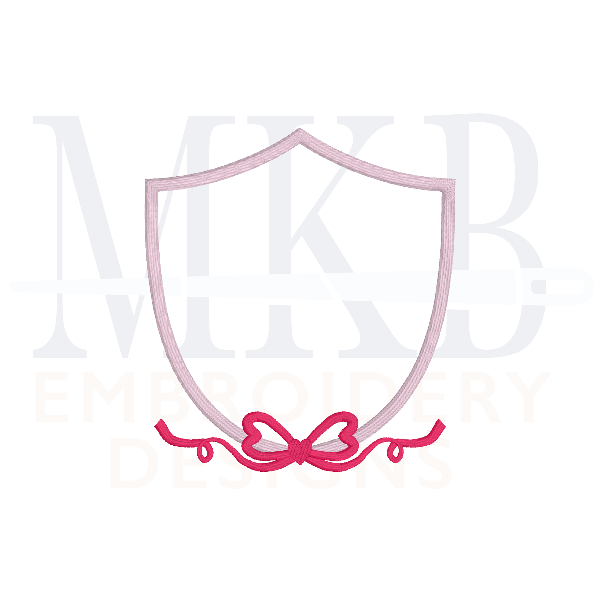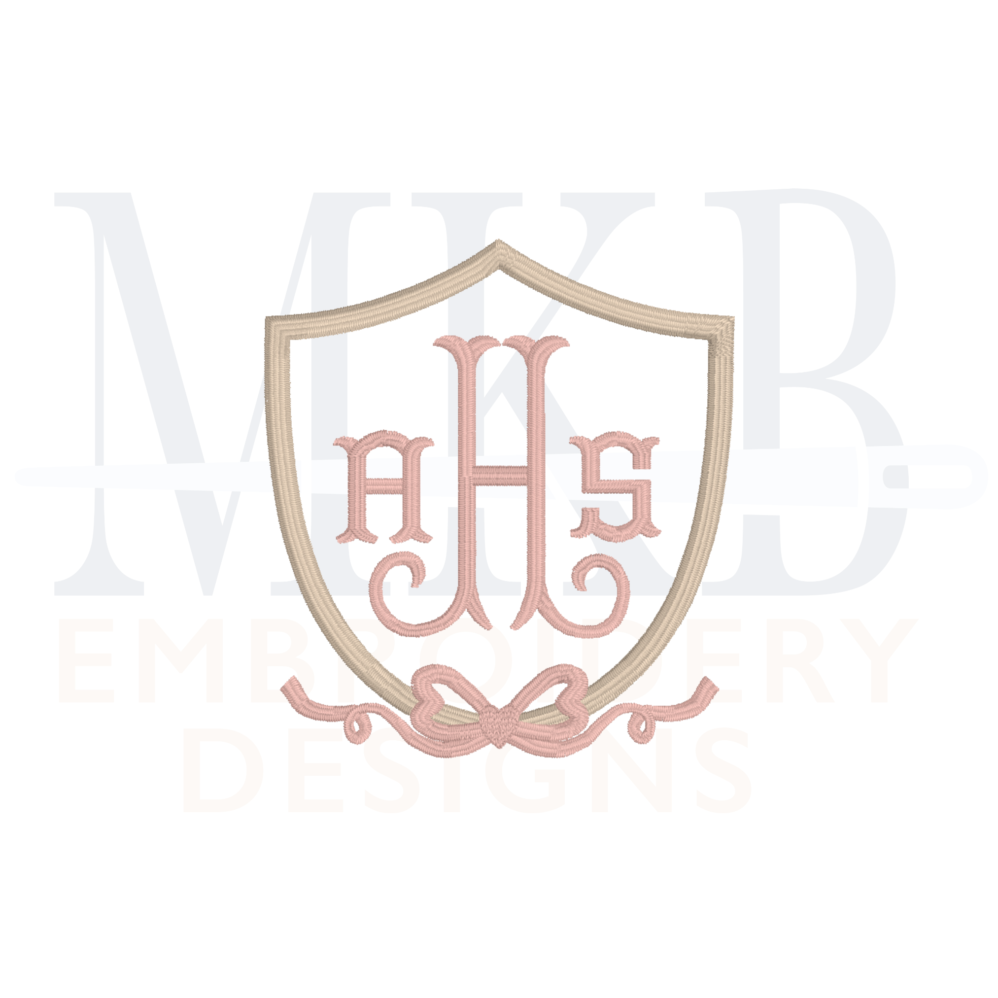 Our bow crest with a center heart knot is a classic and timeless add-on to a monogram. Use this cute bow monogram frame embroidery design to embellish wreath sashes, baby nursery accents, linens, birthday banners, blankets, clothing, bridal linens, Valentine embroidery projects and more! Design has been tested for quality stitching.