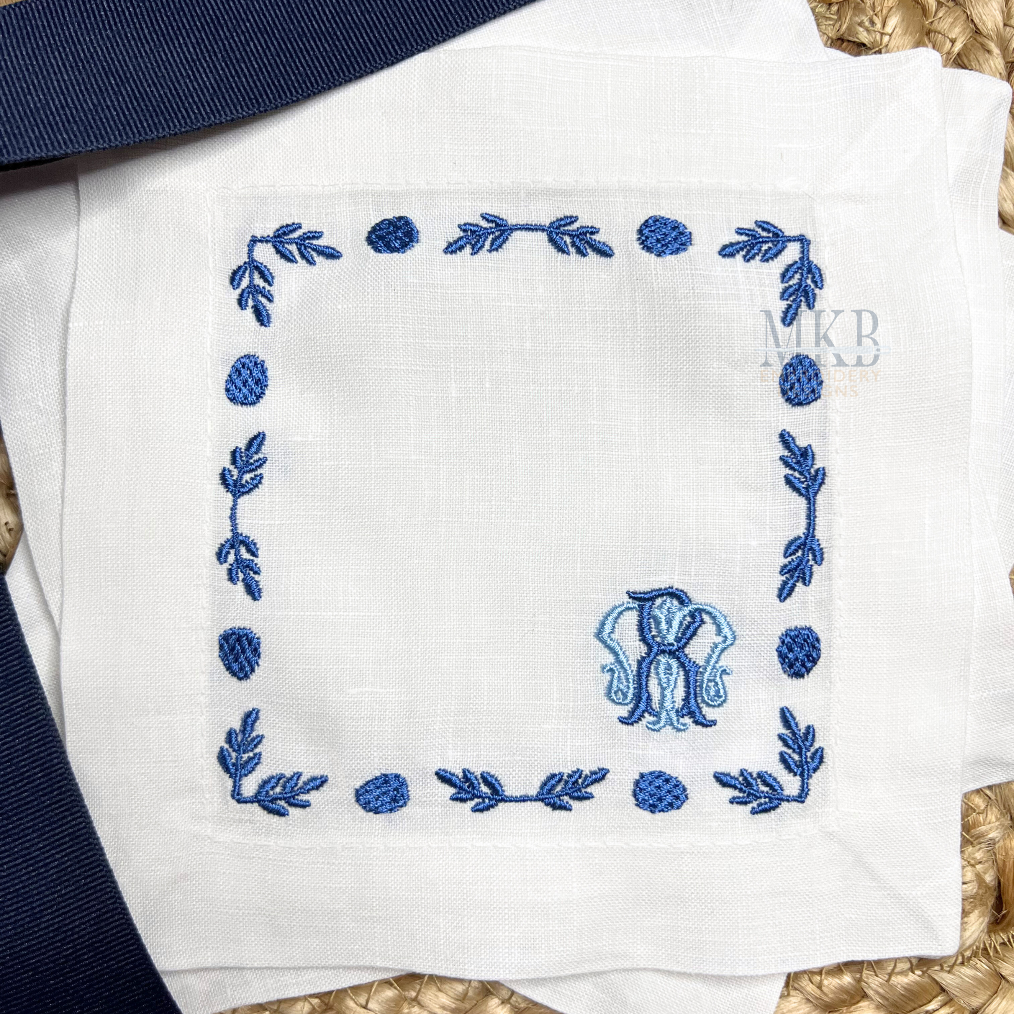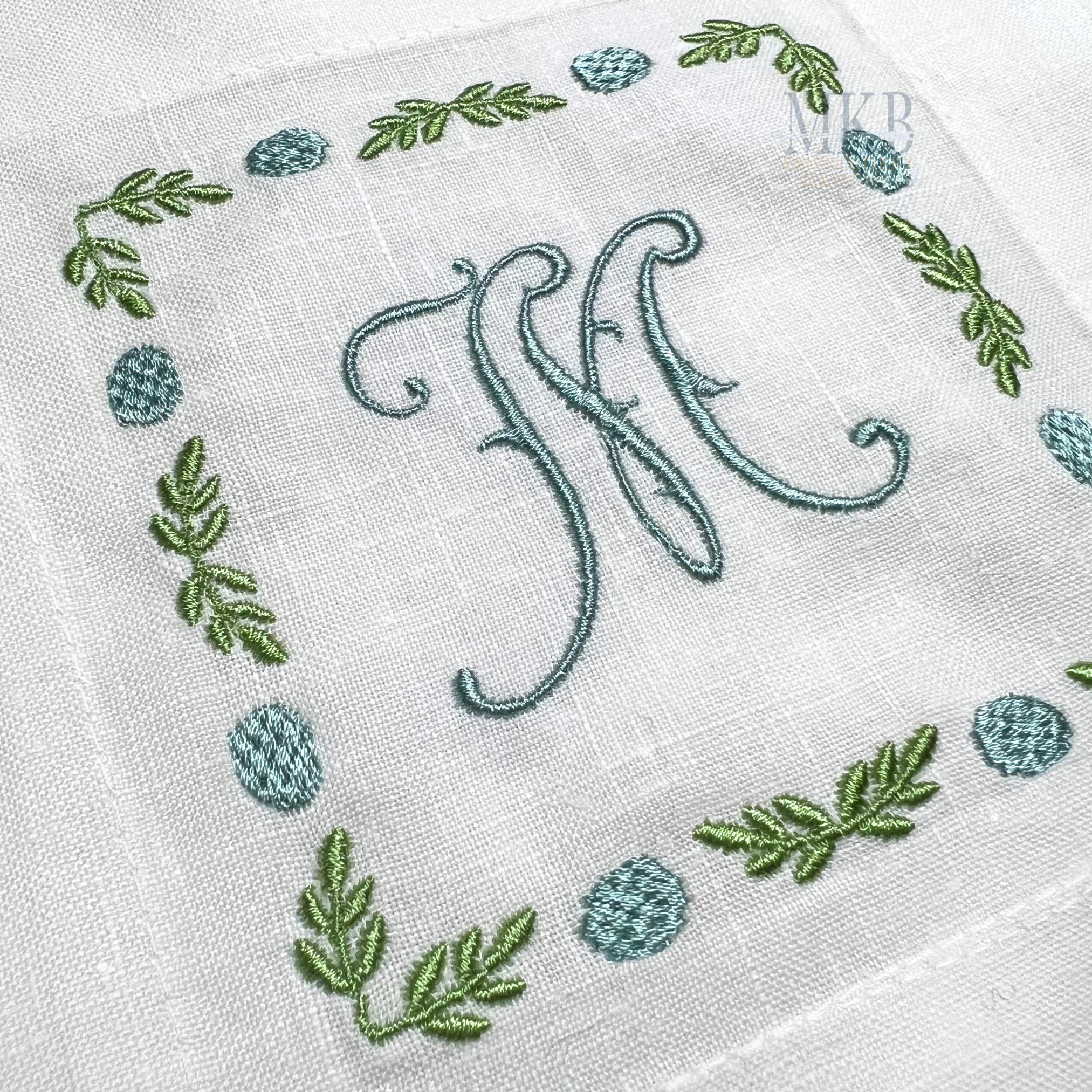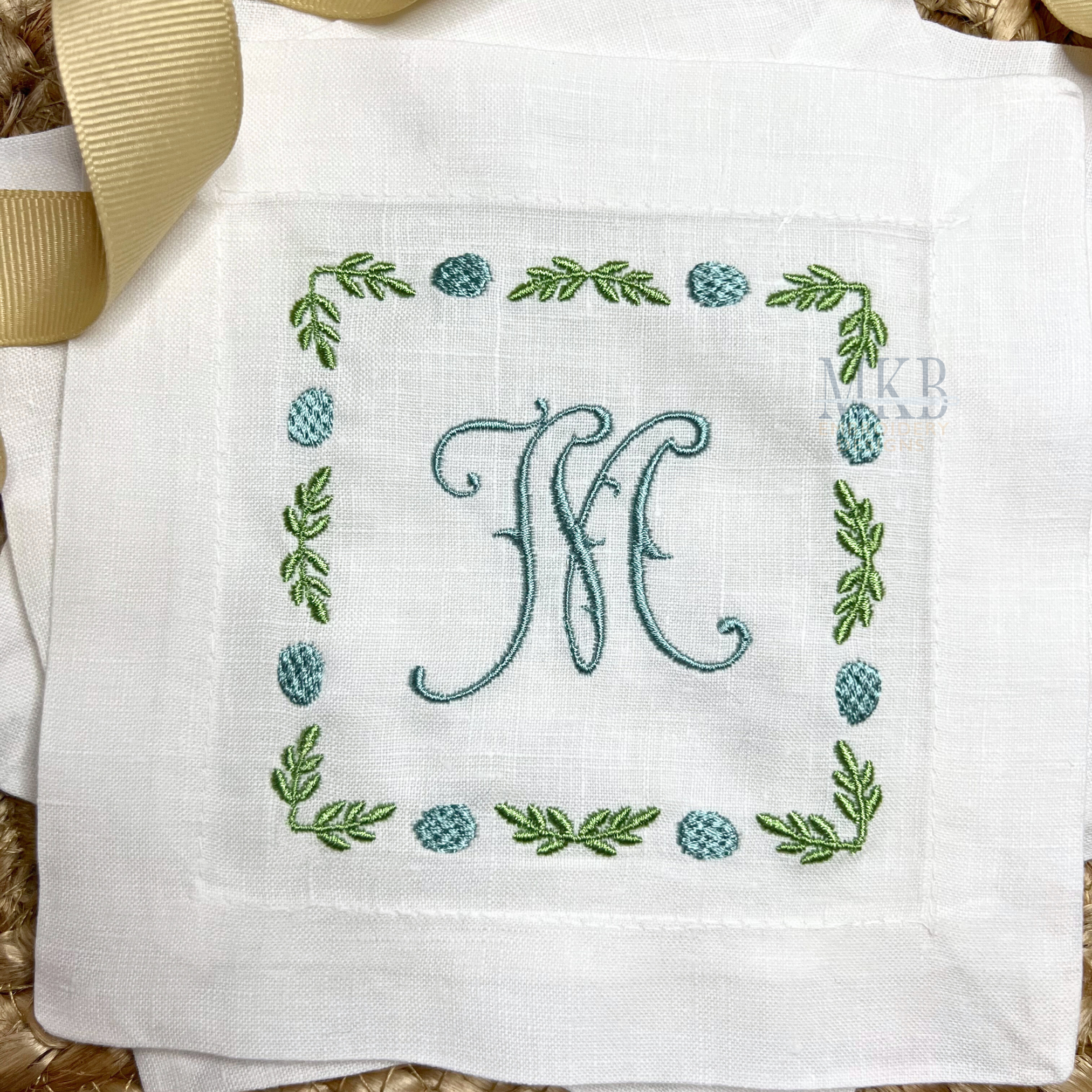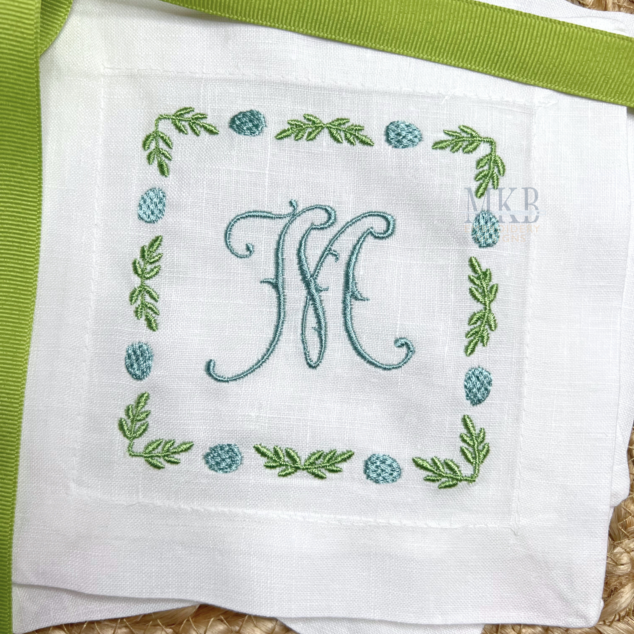 The Easter laurel border is arranged for you and sized to fit inside of a 6x6 cocktail napkin. The Easter egg greenery embroidery design files include three different arrangement sizes, depending on the center space/size of your cocktail napkins. The monogram font frame includes the greenery in a satin stitch and the eggs are in a textured fill stitch. Use this Spring greenery border embroidery design to embellish cocktail napkins or coasters for Easter brunch, Spring cocktails, sprucing up your bar cart, hostess gifts, or any Spring themed celebration. Each of our designs have been tested for quality stitching.