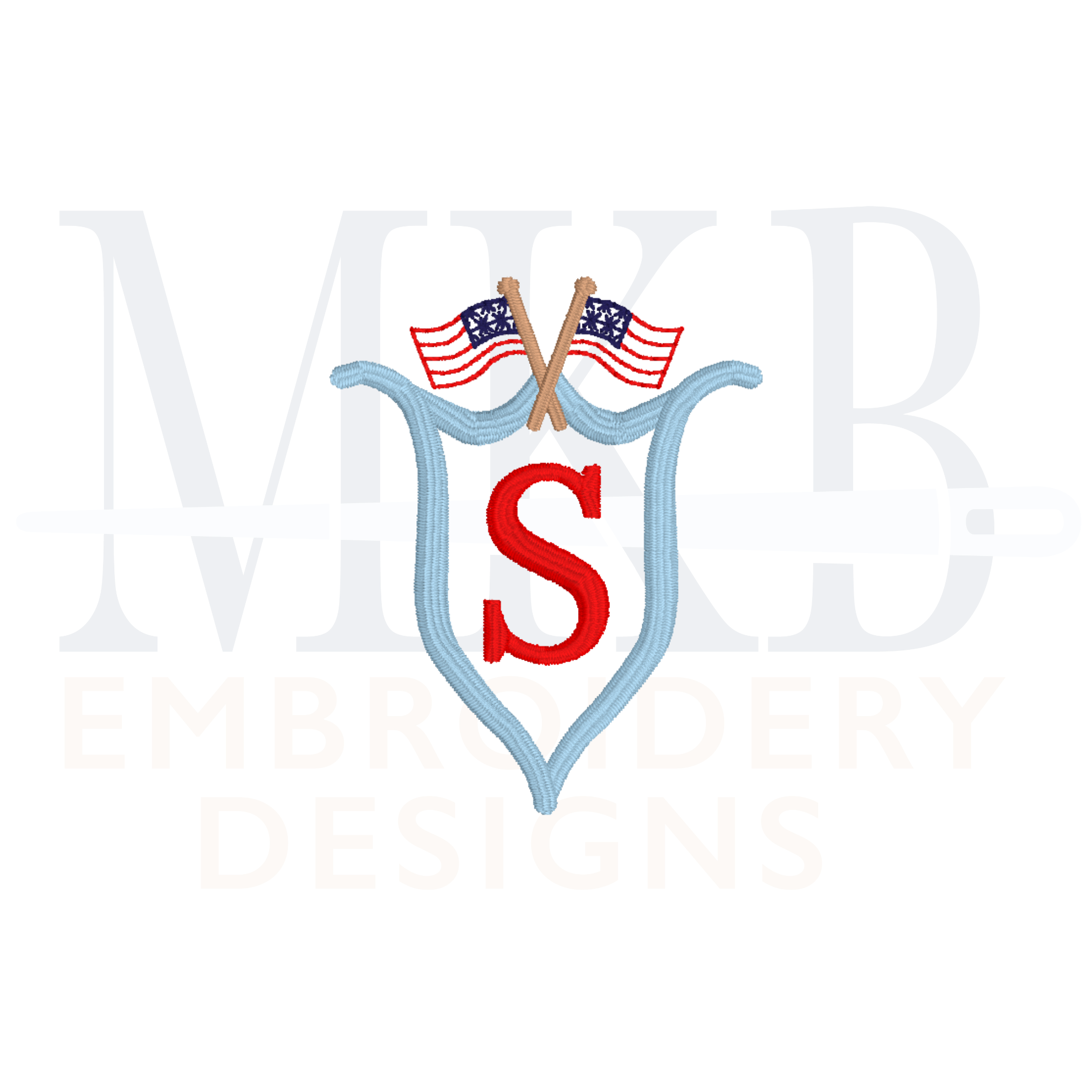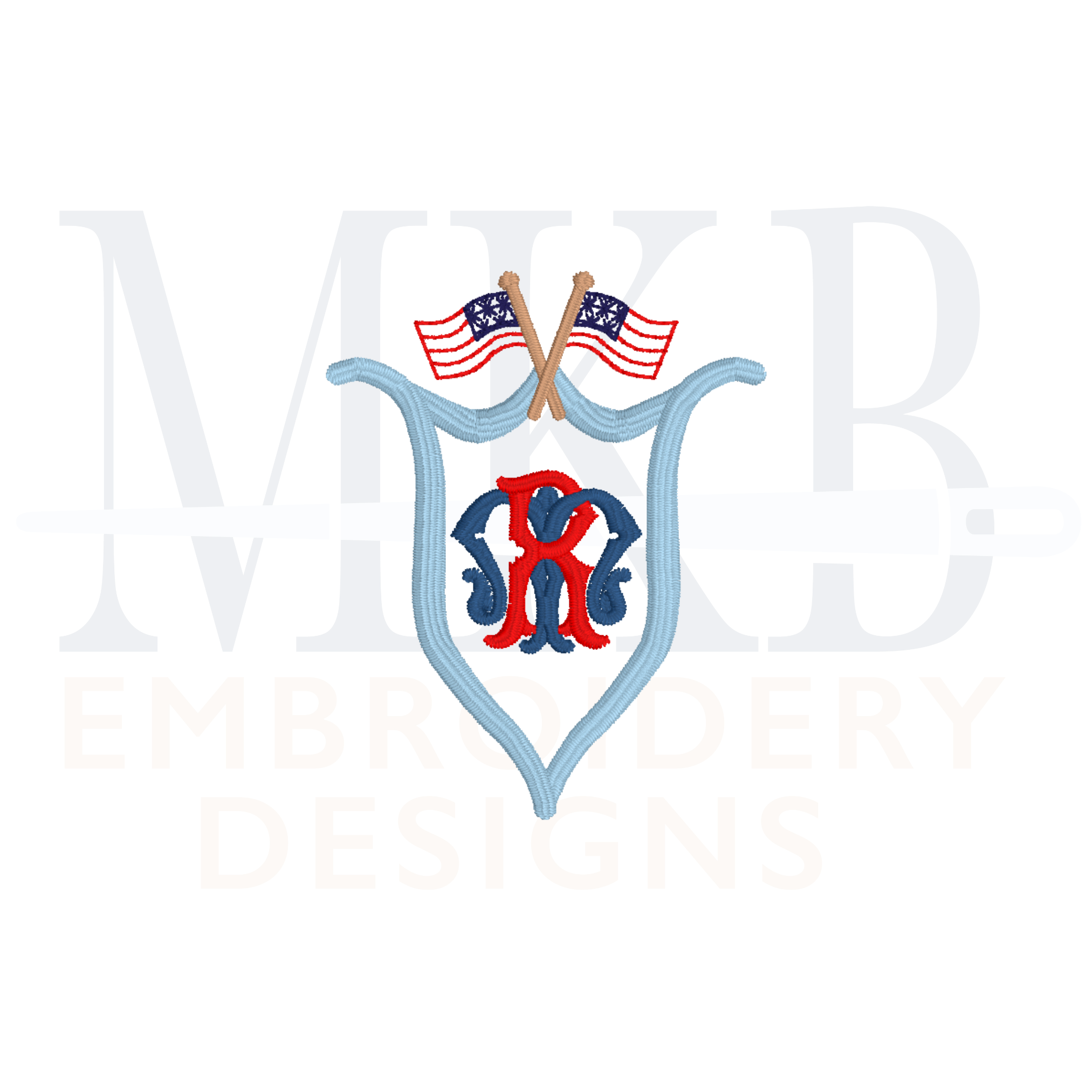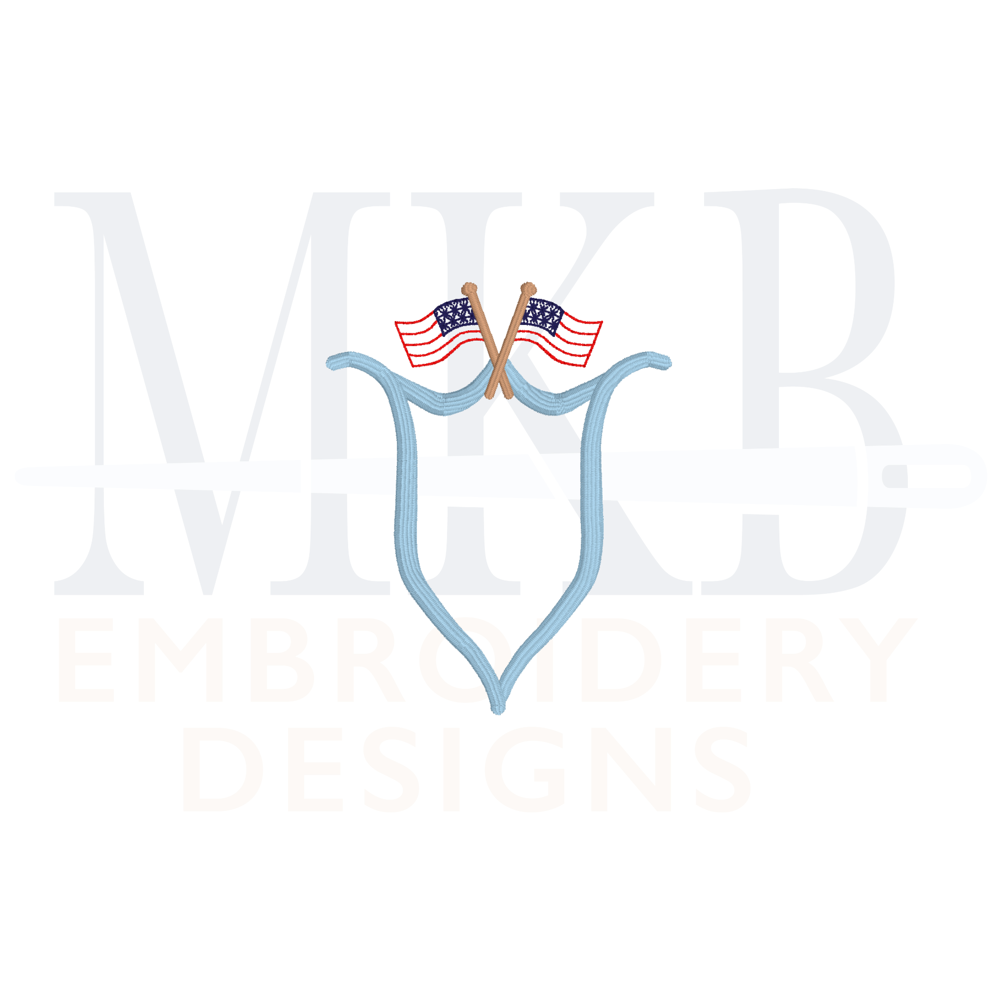 The mini American flag crest is the smaller set of sizes to our larger version. The crossed American flags are in a bean stitch outline. The scroll crest is a satin stitch. Perfect for fourth of July, patriotic, and summer embroidery projects. Use these for guest linens, home decor, hostess gifts, cocktail napkins, tote bags, garments, and more.