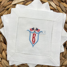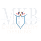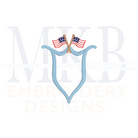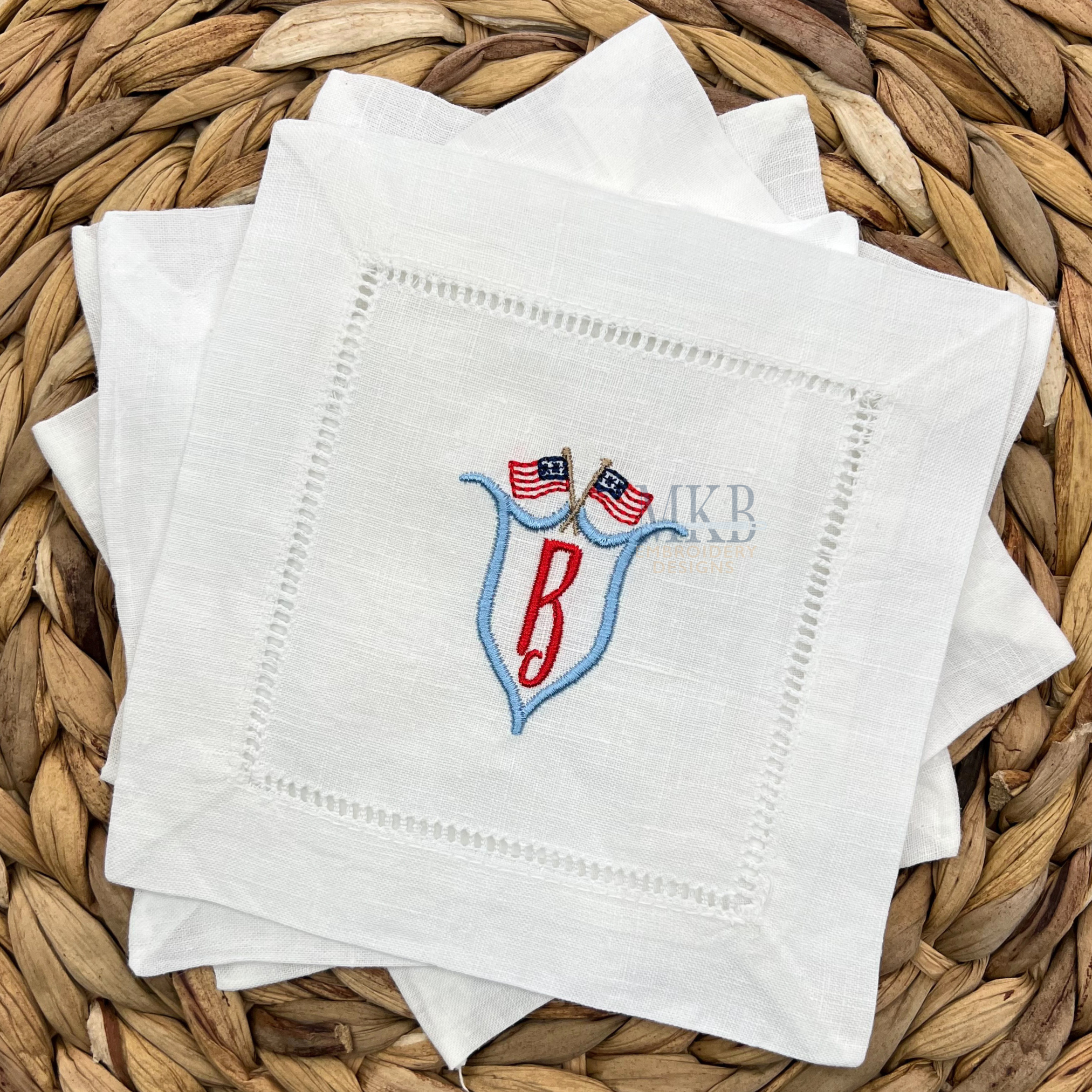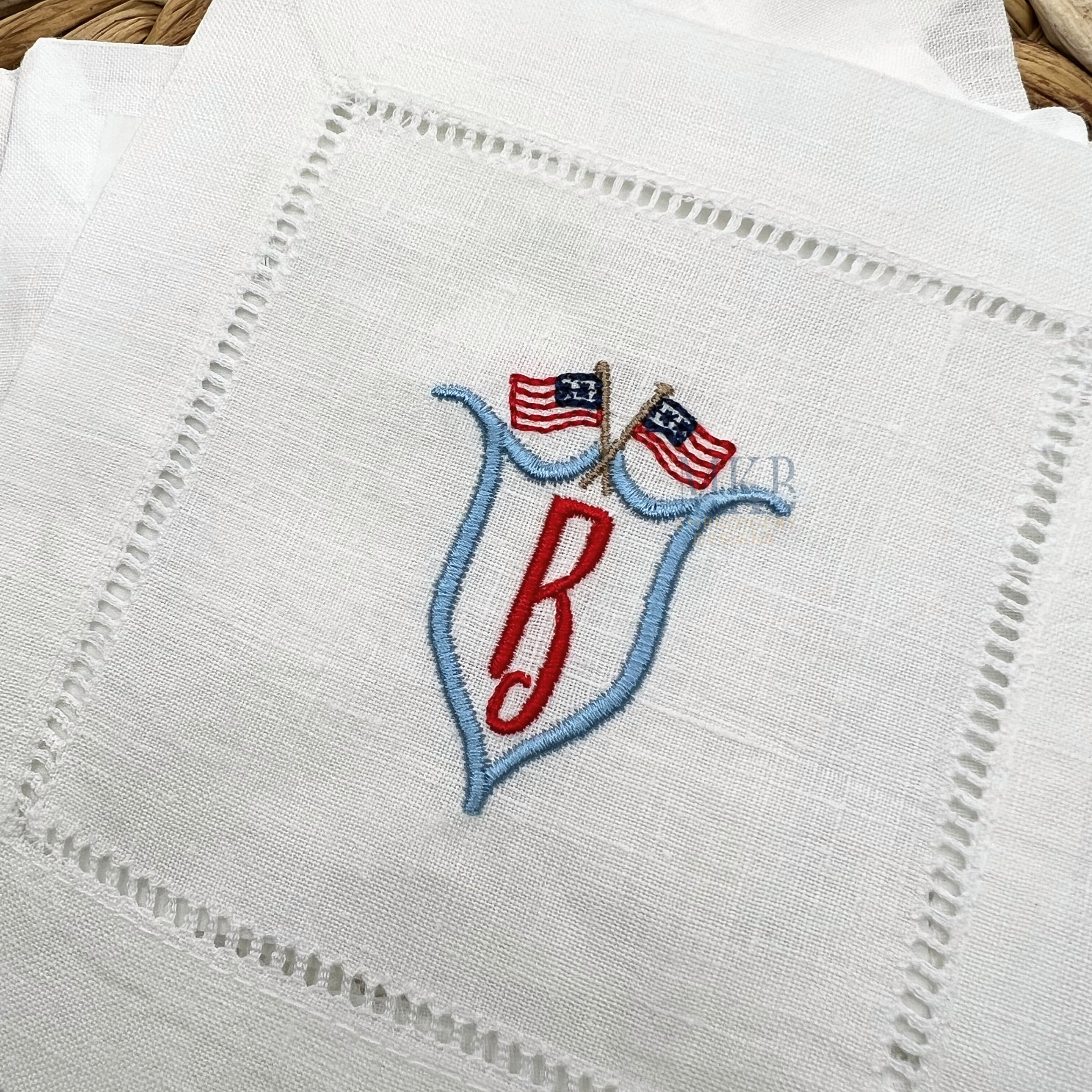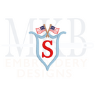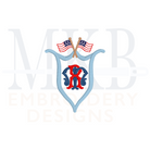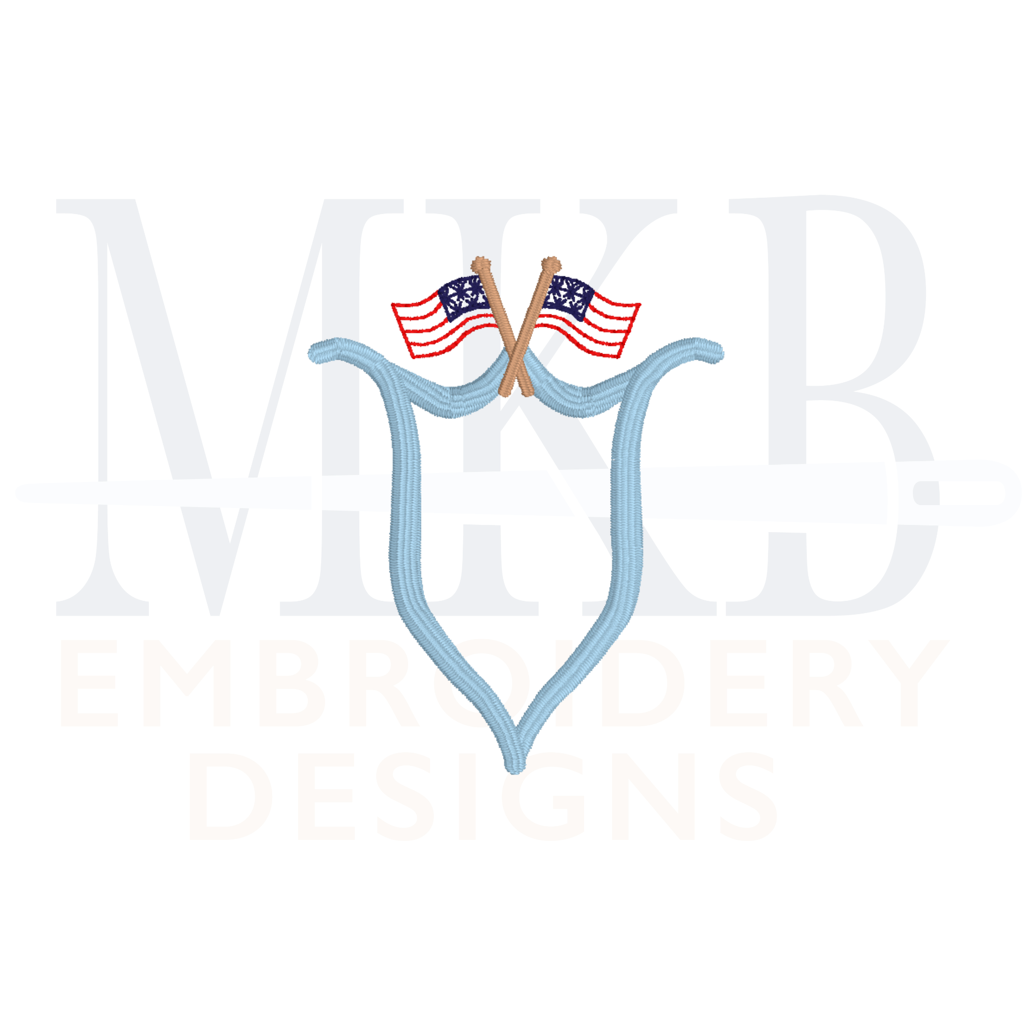 The mini American flag crest is the smaller set of sizes to our larger version. The crossed American flags are in a bean stitch outline. The scroll crest is a satin stitch. Perfect for fourth of July, patriotic, and summer embroidery projects. Use these for guest linens, home decor, hostess gifts, cocktail napkins, tote bags, garments, and more.